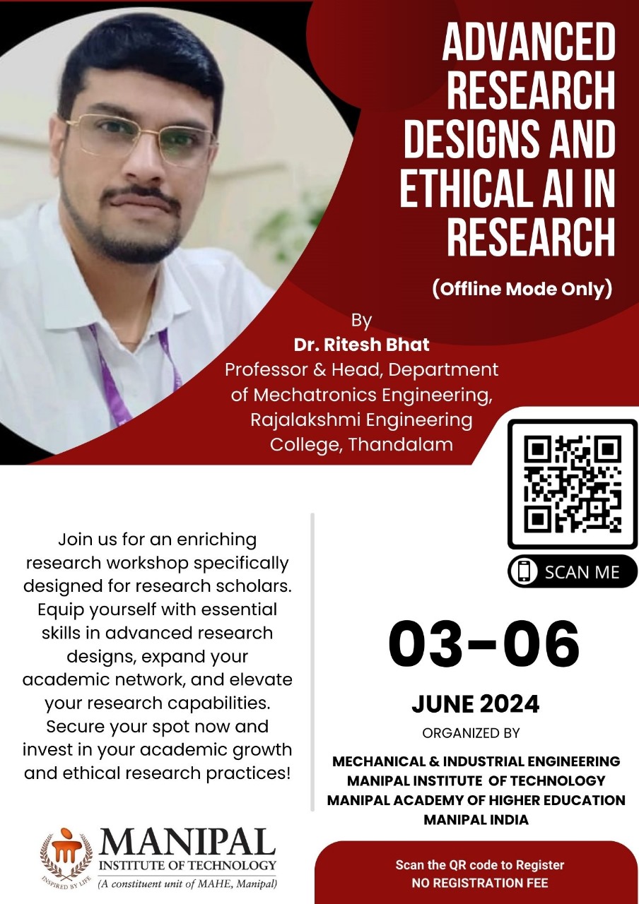 - Four days workshop on "Advanced Research Designs and Ethical AI in Research," delivered by Dr. Ritesh Bhat, Professor, Department of Mechatronics Engineering, Rajalakshmi Engineering College, Chennai, June 3rd to 6th, 2024. (Know more)
