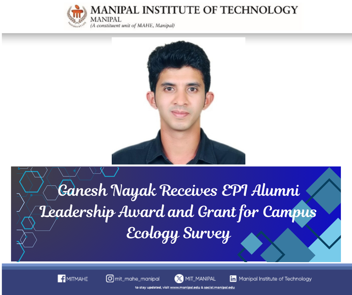Ganesh Nayak from the Department of Instrumentation & Control Engineering has been awarded the prestigious Ecology Project International (EPI) Alumni Leadership Award for his outstanding work with the Centre for Outdoor Studies (COS). As part of this recognition, he has received a grant of $800, which will support an ecological survey of the MIT Manipal campus, documenting birds, reptiles, amphibians, and butterflies.