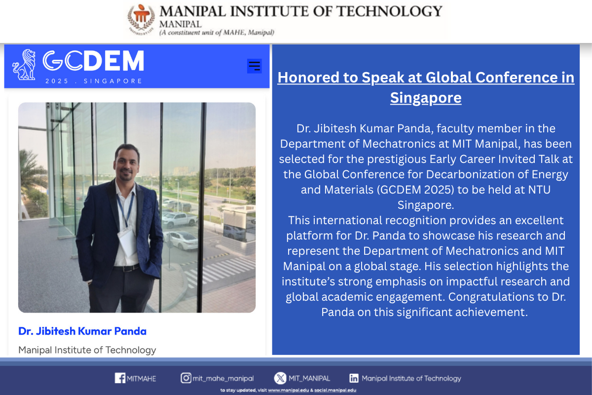 Congratulations to Dr. Spoorthi Singh from the Department of Mechatronics for being invited as a Distinguished Speaker at the 2025 International Conference on Green Economy, Sustainable Development Goals (SDGs), and AI for Green Technologies, organized by Godavari Global University, Rajamahendravarma from 27th to 29th August 2025.