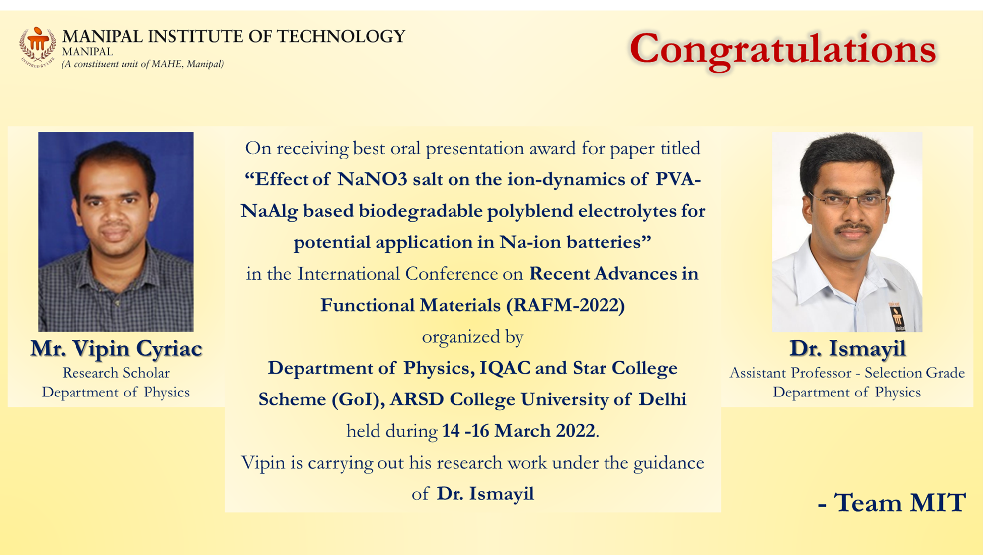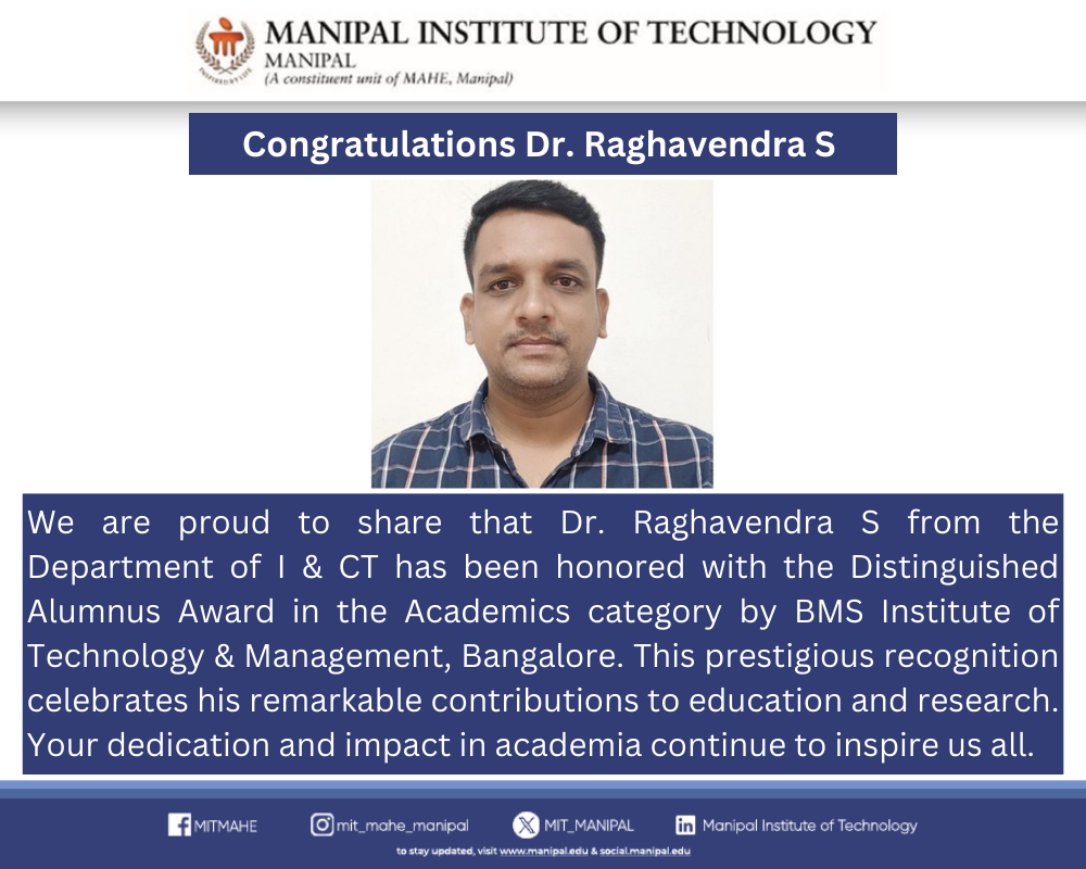 We proudly congratulate Dr. Raghavendra K. Holla, Faculty Member, Department of Civil Engineering, MIT Manipal, on being honored with the prestigious Anantha Mitra Kalabhavi Award. The award was conferred during the Engineers’ Day Celebrations and Techno Week program held at St. Sebastian Church Hall, Bendur, on 18th September 2025.