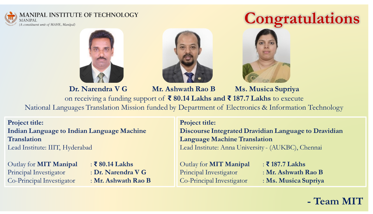 Heartiest congratulations to Dr. Muralikrishna H from the Department of E&C and the entire team for securing the prestigious grant for the project titled "InDyslexiaCare: AI-based Assistive Technology for Dyslexic Children in Indic Languages." This funding has been awarded by IIT Mandi iHub and HCI Foundation, located at IIT Mandi, Himachal Pradesh, under the Department of Science and Technology (DST)’s NM-ICPS (National Mission on Interdisciplinary Cyber-Physical Systems) scheme.