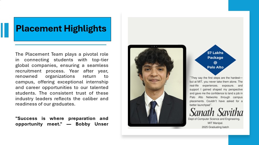 Manipal Institute of Technology, Manipal has been listed among 10 Colleges in India with Highest Placement Packages in an article published in Times of India (TOI) dated January 12, 2024.