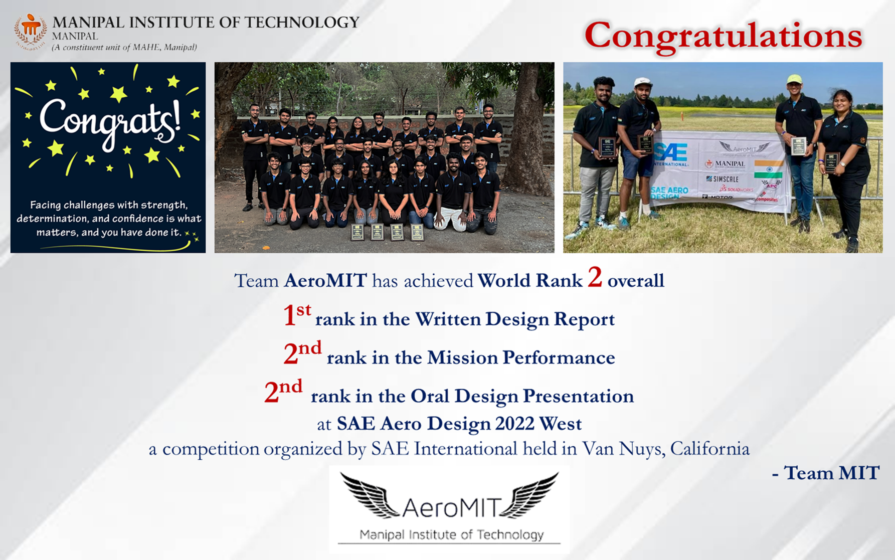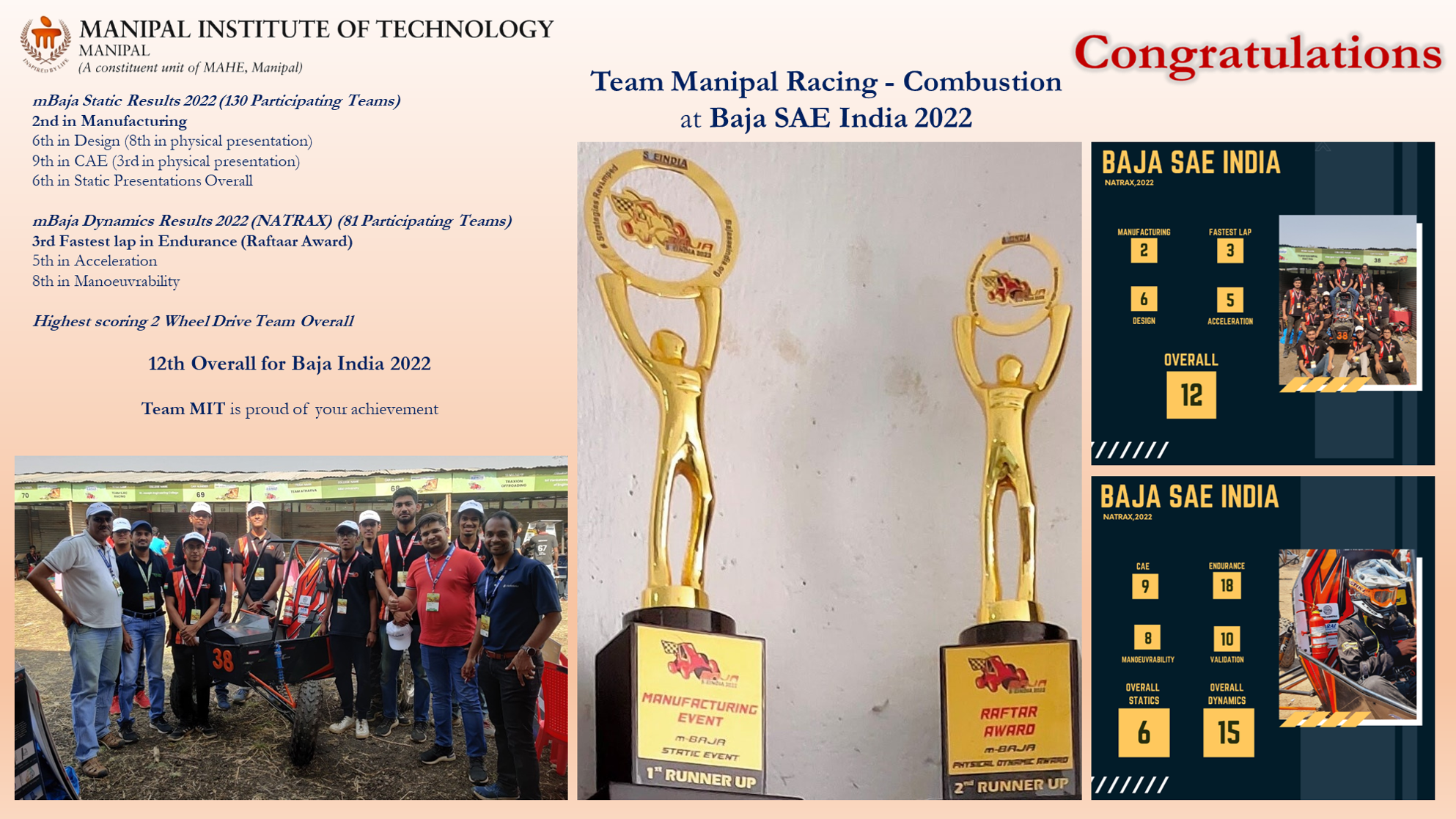 Heartiest congratulations to Team Manipal Racing for your remarkable performance in the national-level SAE BAJA 2025 competition held at NATRAX, Pithampur, near Indore. Your outstanding achievements in multiple events make us extremely proud. Wishing you continued success in all your future endeavors.