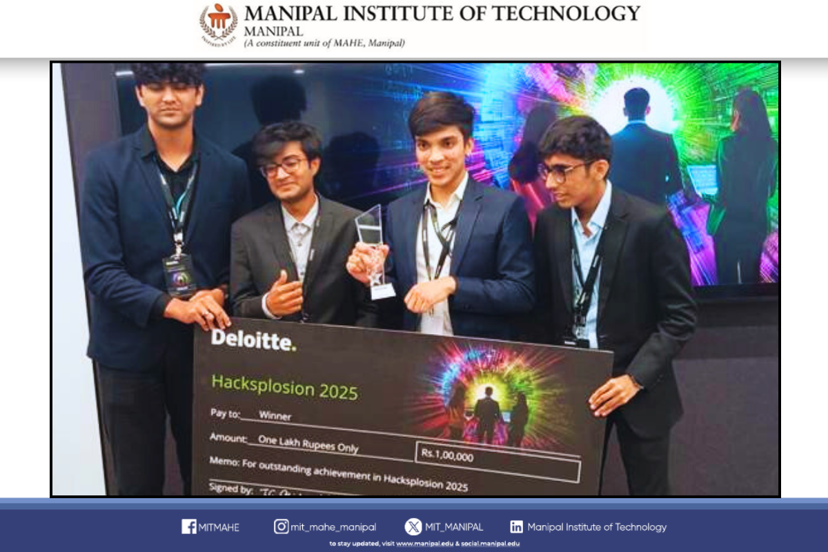 MIT Manipal has once again demonstrated its brilliance on the grand stage of innovation, emerging victorious at the prestigious Hacksplosion Hackathon hosted by Deloitte India in Bengaluru. Heartfelt congratulations to the stellar team—Aditya Gosavi, Krish Didwania, Kavish Paresh Shah, and Shaurya Gupta—whose ingenuity and perseverance, guided by their mentor Dr. Manoj from the Department of Computer Science and Engineering, have brought this remarkable honor to the institution.