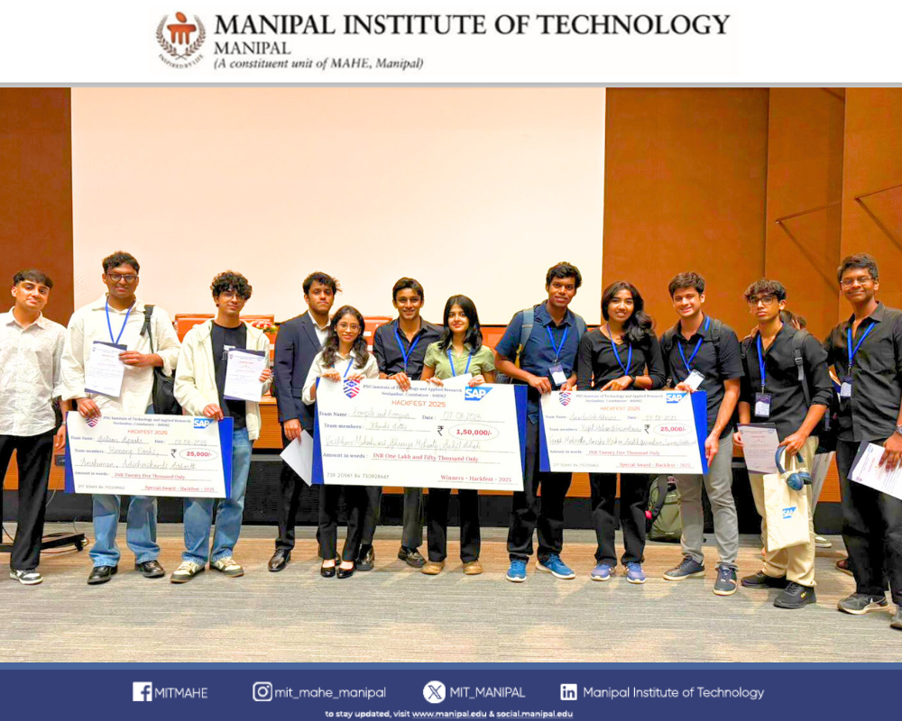Manipal Institute of Technology (MIT), Manipal, achieved remarkable success at the prestigious SAP HACKFEST 2025, a national-level innovation challenge that saw participation from over 5,000 teams and 26,000 students across India. The competition focused on developing technology-driven solutions for sustainable livelihoods, cultural sustainability, and equitable economics.