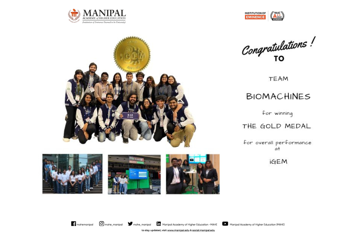 Team Manipal BioMachines from MIT–MAHE achieved remarkable success at the International Genetically Engineered Machine (iGEM) Competition 2025, held in Paris, France. The team received a Gold Medal for their innovative project, recognizing their excellence in research, innovation, and human practices.