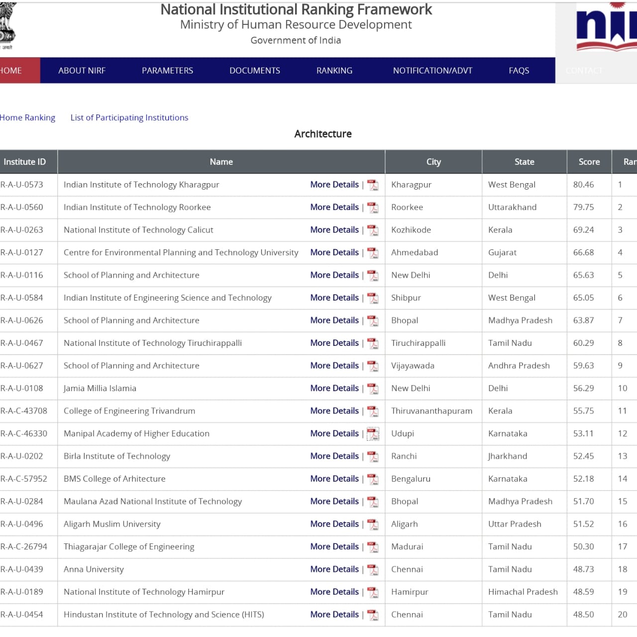 Manipal Academy of Higher Education has ranked 12th in NIRF ranking under Architecture.