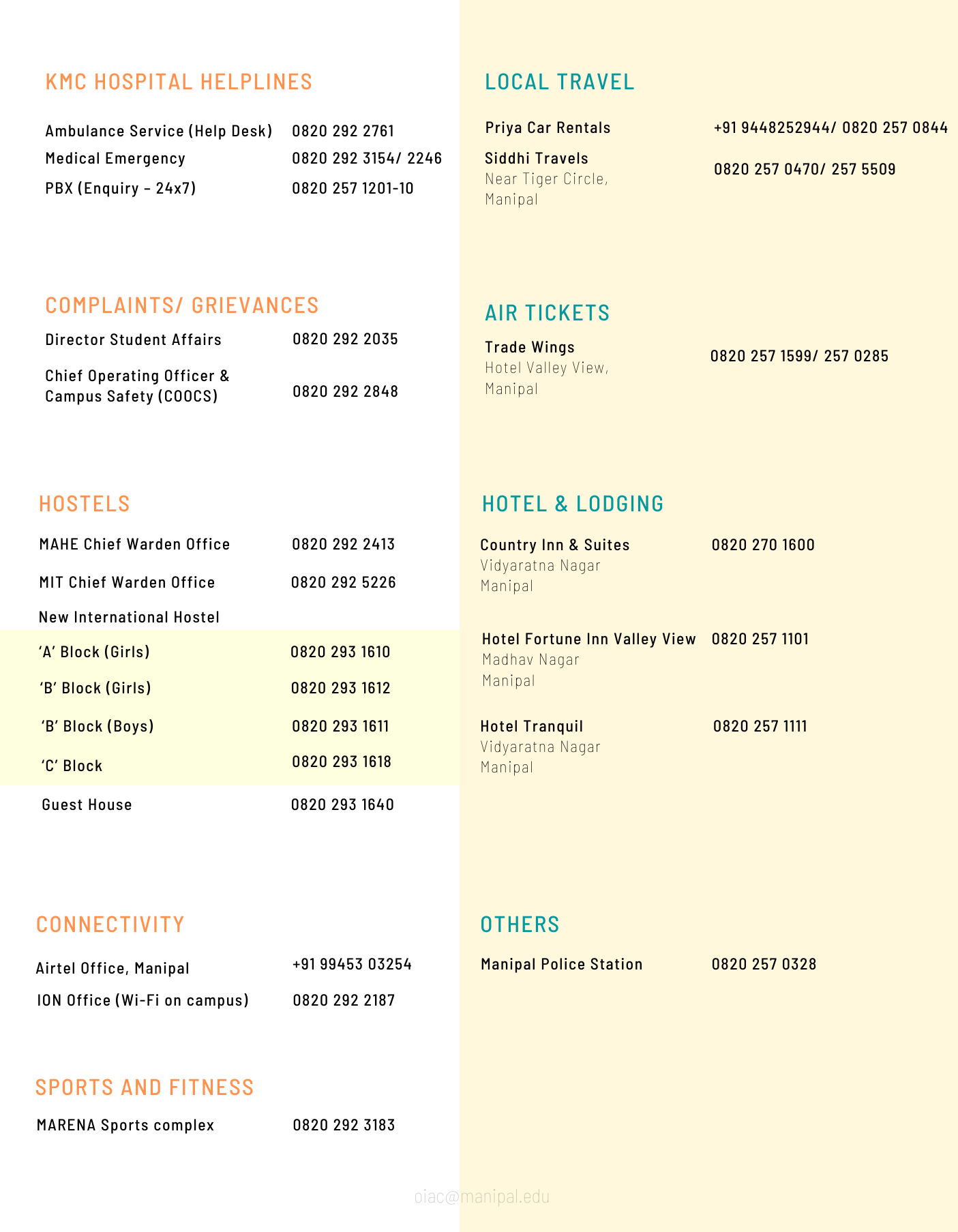 For queries relating to Satkar Paradise and NIH Hostel contact: chiefwarden.mahe@manipal.edu; Phone: (+91) 820 2922413
