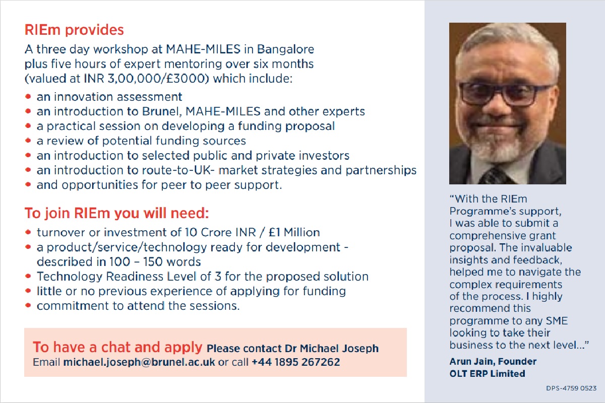 Brunel University London has partnered with Manipal Centre for Innovation Leadership and Entrepreneurship to launch RIEm in India.