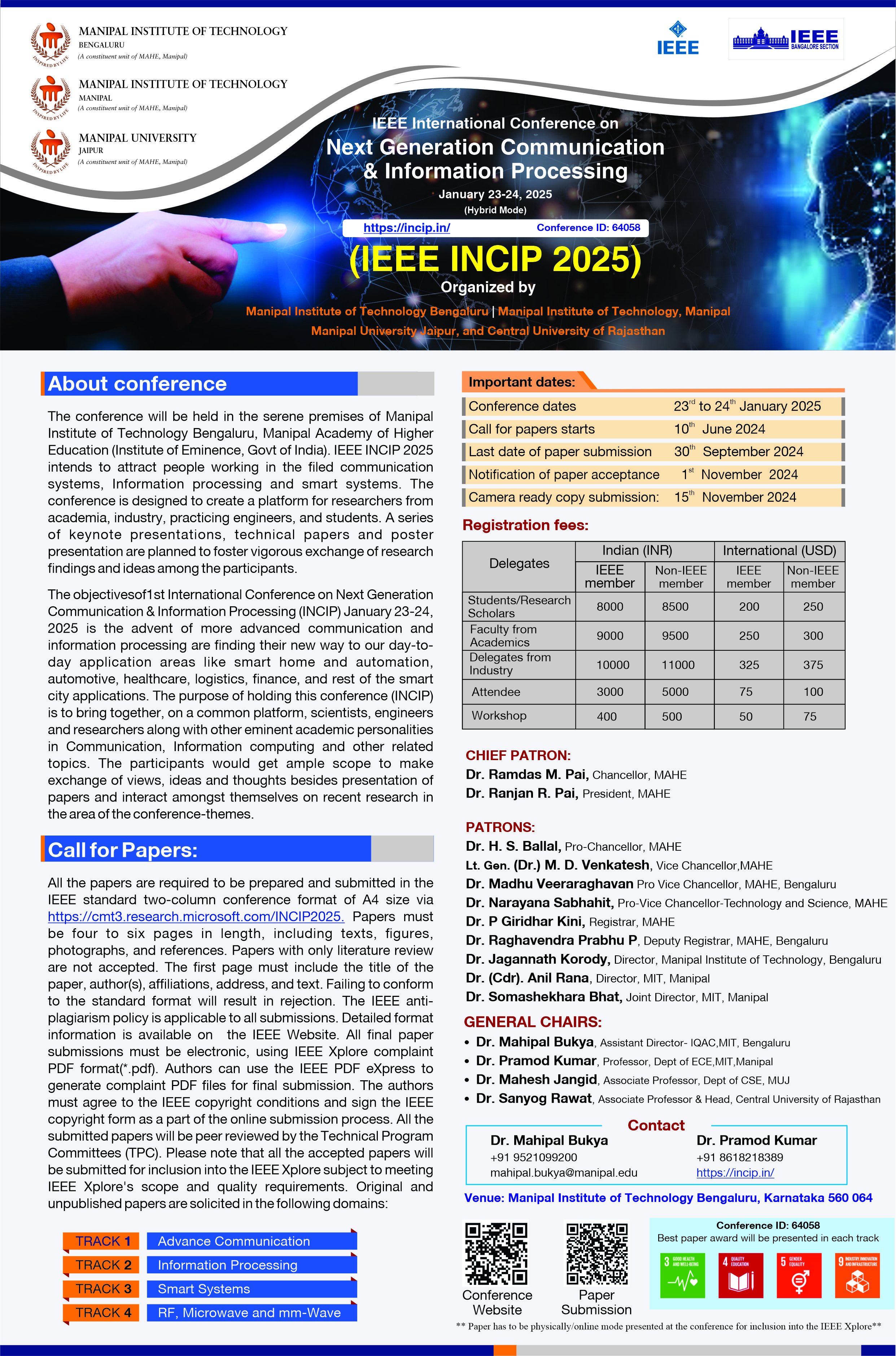 We are happy to inform you that MIT Bengaluru campus, is organizing the 1st IEEE International Conference on "International Conference on Next-Generation Communication & Information Processing | INCIP 2025, during January 23-24, 2025. MIT Bengaluru campus invites delegates from academia and industry to be part of the two-day International Conference on Next Generation Communication & Information Processing (INCIP 2025).