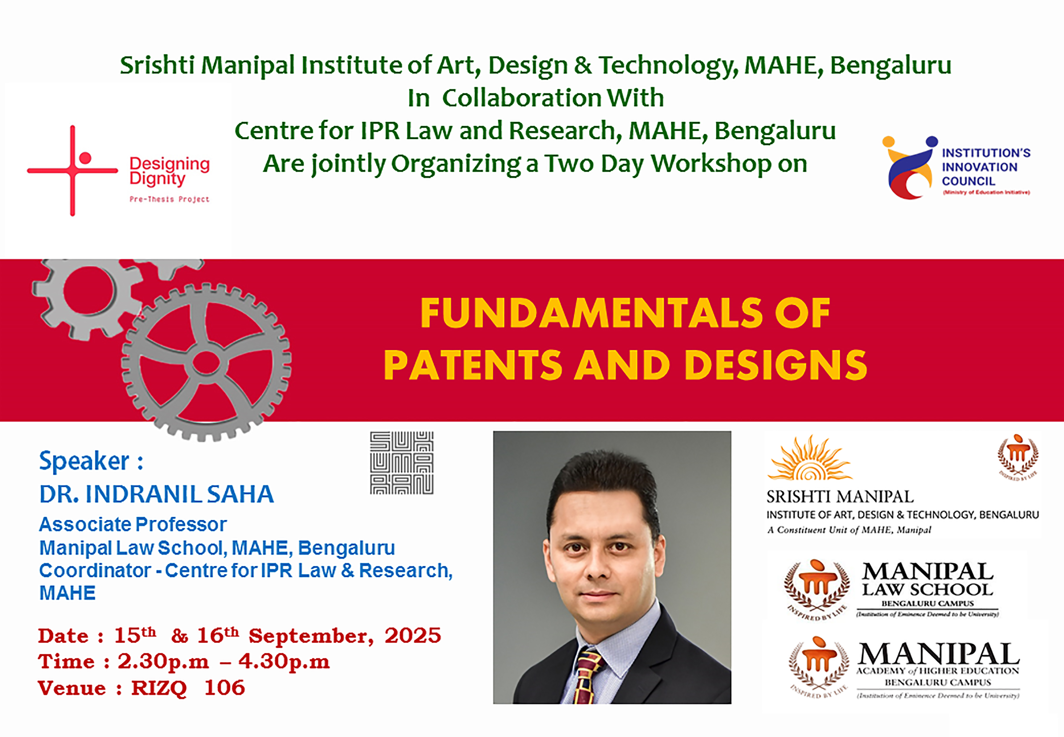 (10) Dr Indranil Saha, Coordinator of the Centre was an invited speaker in the two day workshop, as an expert, on the topic of “Fundamentals of Patents and Designs”, Srishti Manipal Institute of Art, design and Technology, Bengaluru, in collaboration with Centre for IPR Law & Research, MAHE, Bengaluru, 15th – 16th September, 2025.