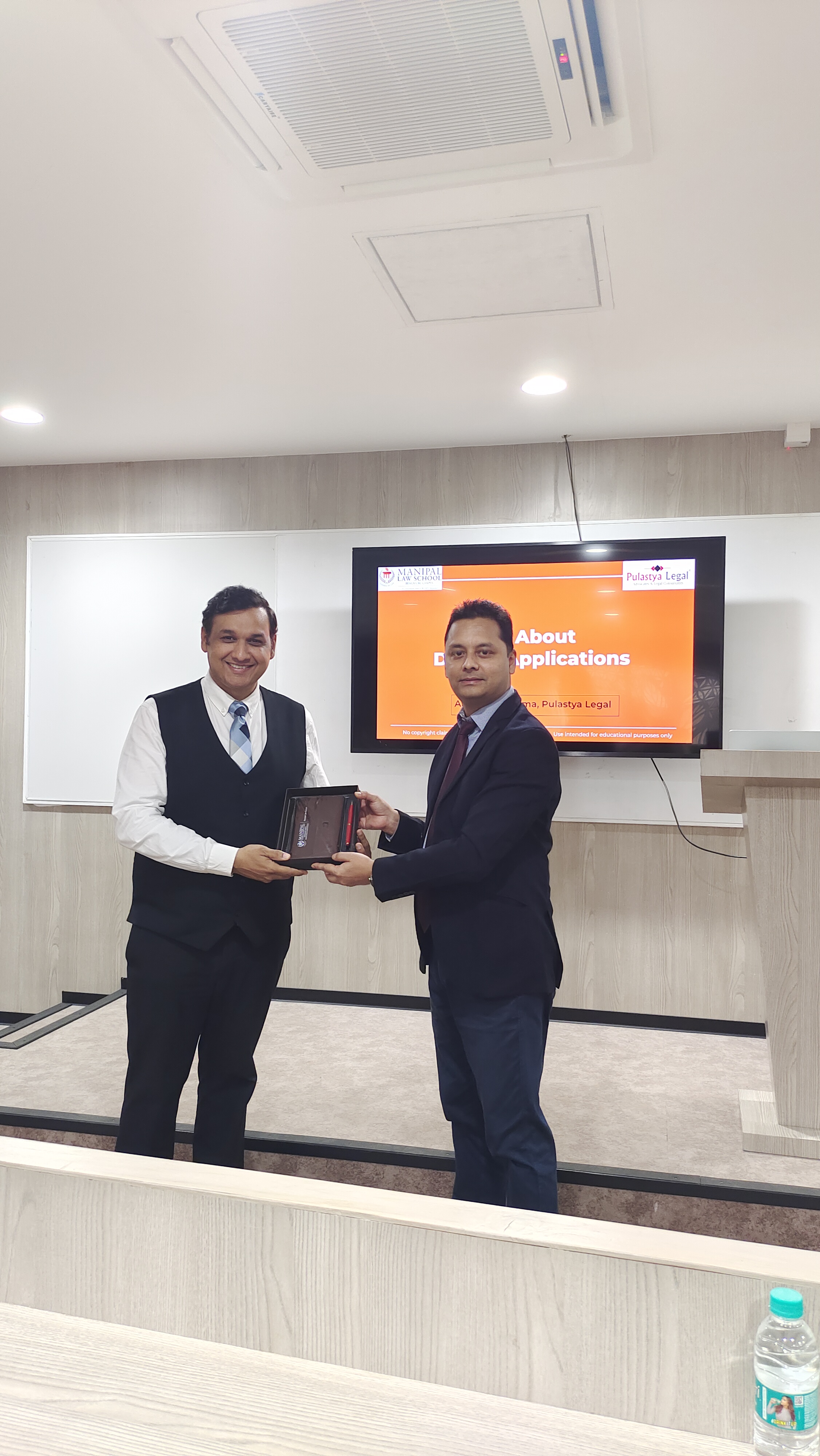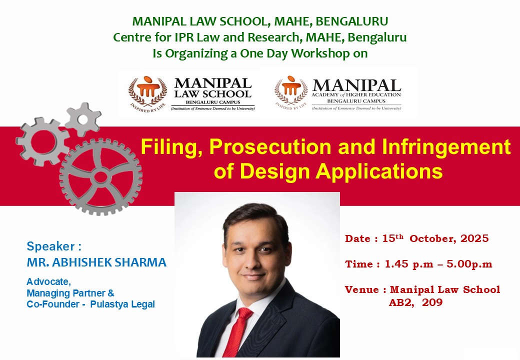(12) Manipal Law School, MAHE- Bengaluru and Centre for IPR Law and Research, MAHE, organised a 3-hour workshop on “FILING, PROSECUTION AND INFRINGEMENT OF DESIGN APPLICATIONS” on 15th October, 2025. The event hosted Mr. Abhishek Sharma Partner and Co-Founder of Pulastya Legal Services LLP, as the resource person.
