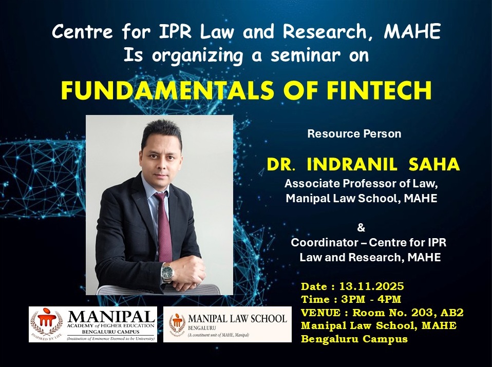 (13) Dr Indranil Saha, Coordinator of the Centre was an invited speaker as an expert, in the one day seminar on the topic of “Fundamentals of Fintech”, Manipal Law School, Bengaluru, in collaboration with Centre for IPR Law & Research, MAHE, 13th November, 2025.