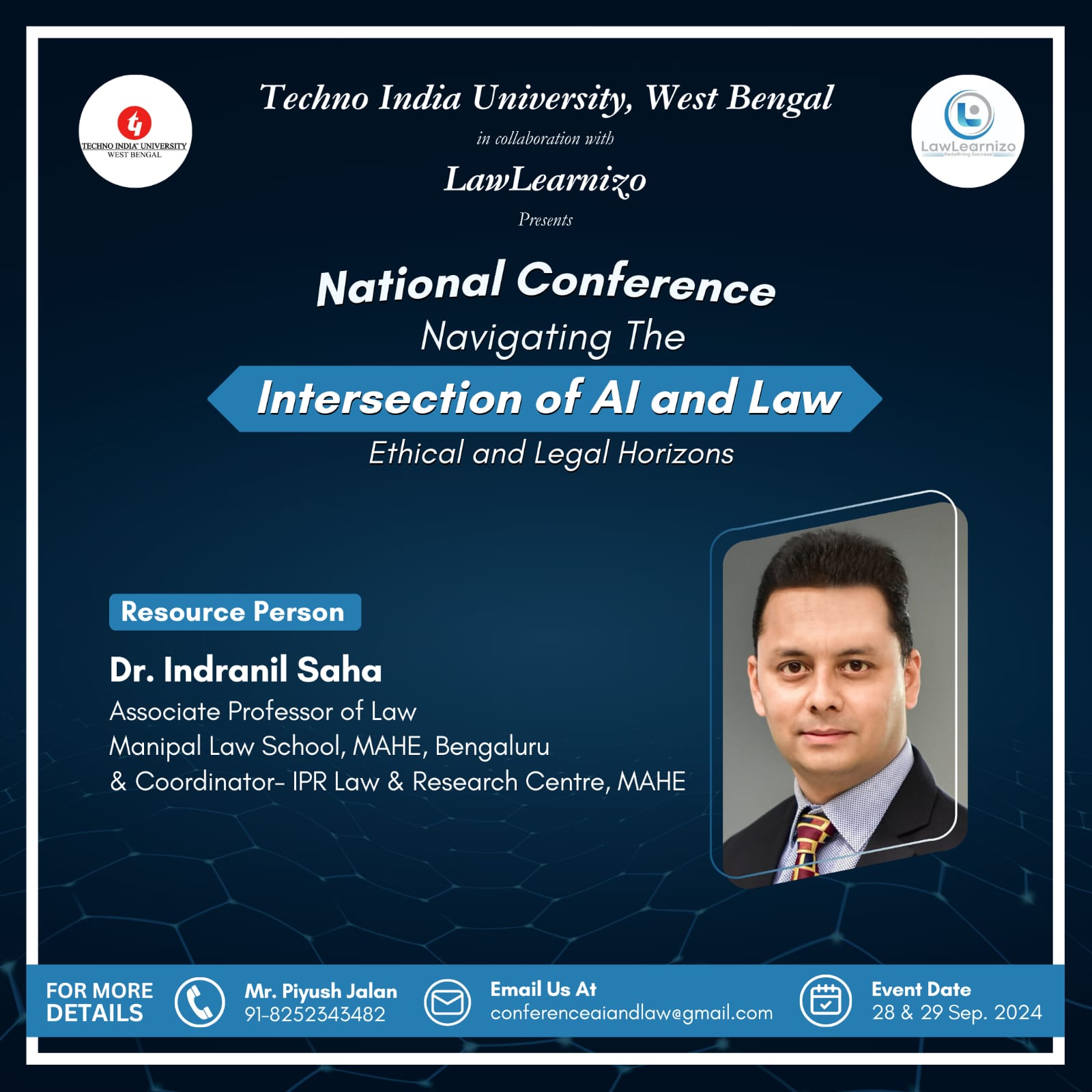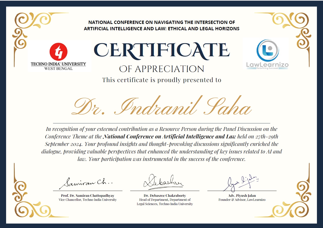 (1) On behalf of the Centre, Dr Indranil Saha, Coordinator of the Centre was an invited speaker and panelist as an expert at the National Conference on Navigating the Intersection of Artificial Intelligence and Law: Ethical and Legal Horizons, Techno India University, 27-29 September 2024.