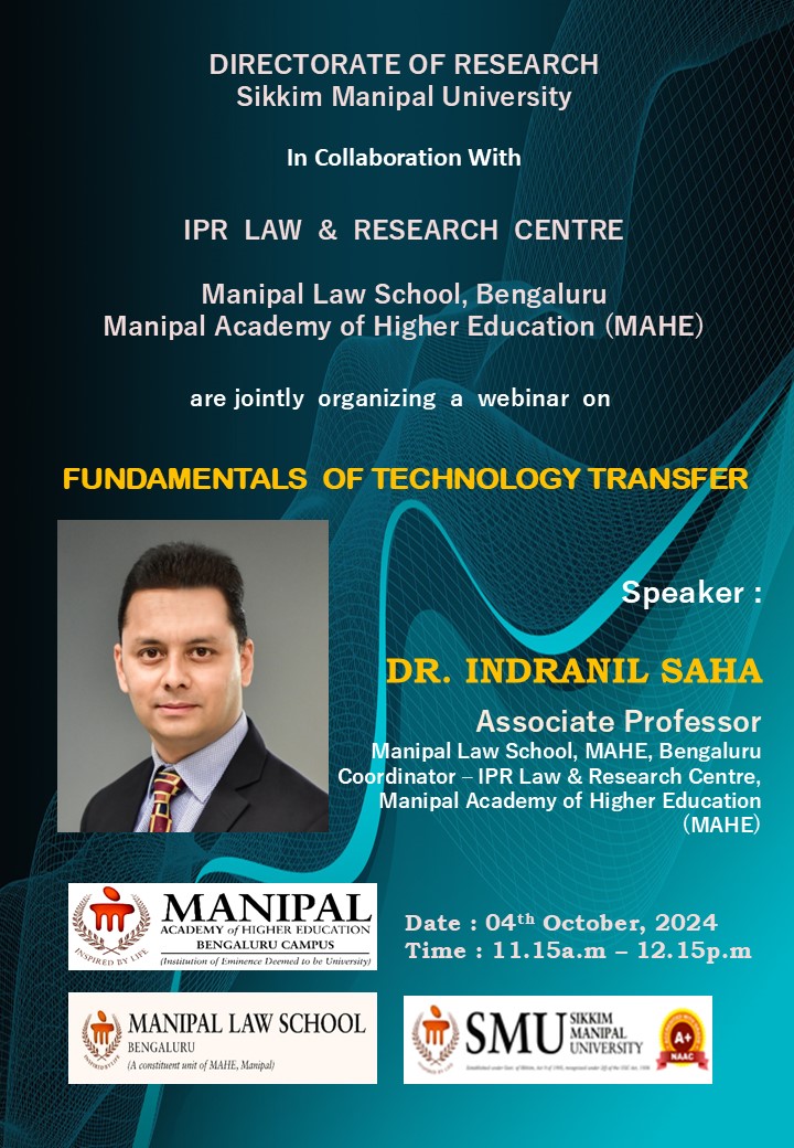 (2) Dr Indranil Saha, Coordinator of the Centre was an invited speaker as an expert on the topic of “Fundamentals of Technology Transfer”, Sikkim Manipal University in collaboration with the Centre for IPR Law and Research Centre, MAHE, 14 October 2024.
