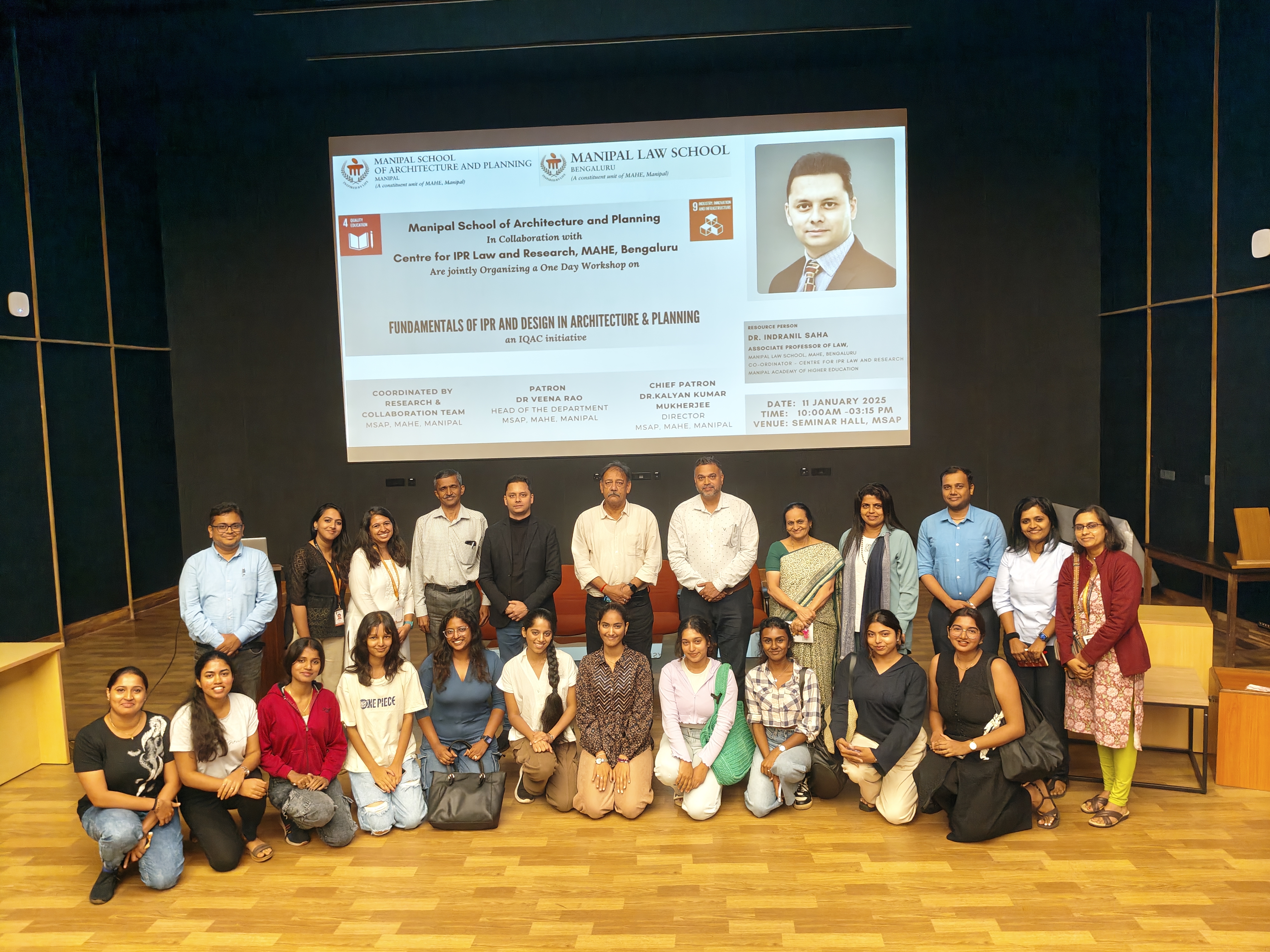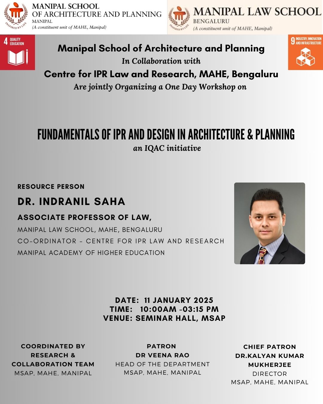 (3) Dr Indranil Saha, Coordinator of the Centre was an invited speaker in the one day workshop as an expert on the topic of “Fundamentals of IPR and Design in Architecture and Planning”, Manipal School of Architecture and Planning, MAHE in collaboration with Centre for IPR Law & Research, MAHE, 11th January, 2025.