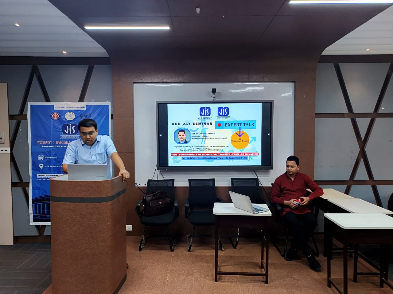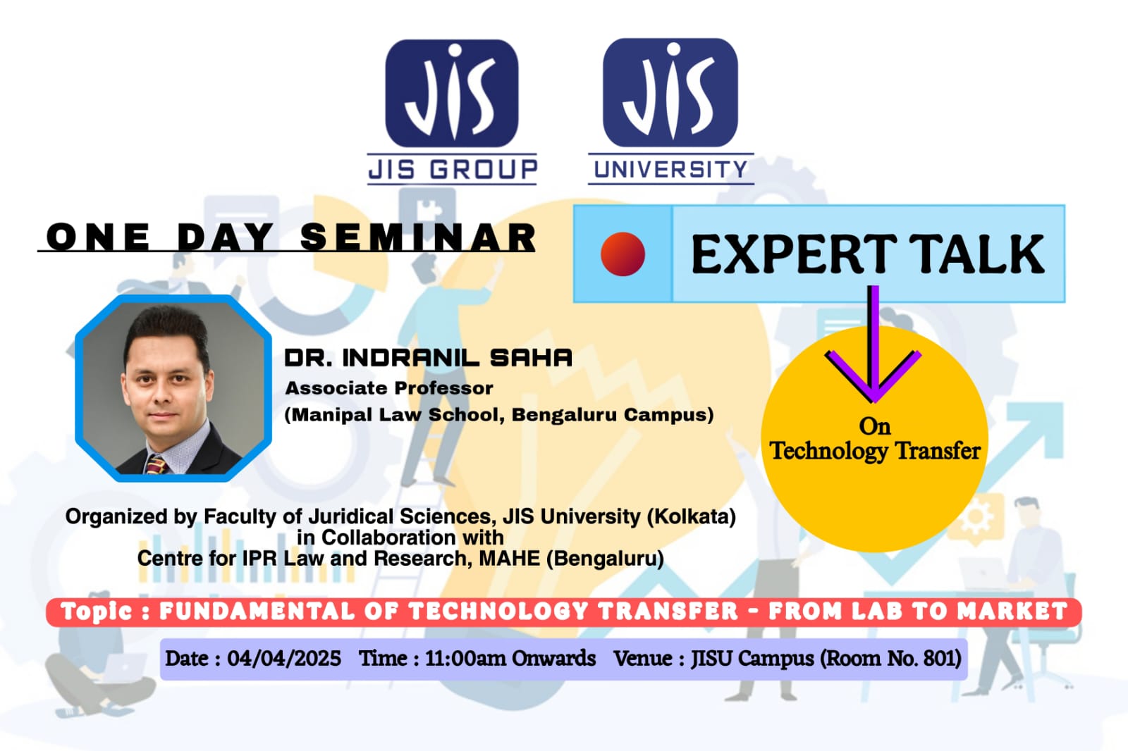 (5) Dr Indranil Saha, Coordinator of the Centre was an invited speaker as an expert in one day seminar on the topic of “Fundamentals of Technology Transfer”, Faculty of Juridical Sciences, JIS University, Kolkata in collaboration with Centre for IPR Law & Research, MAHE, 04th April, 2025.