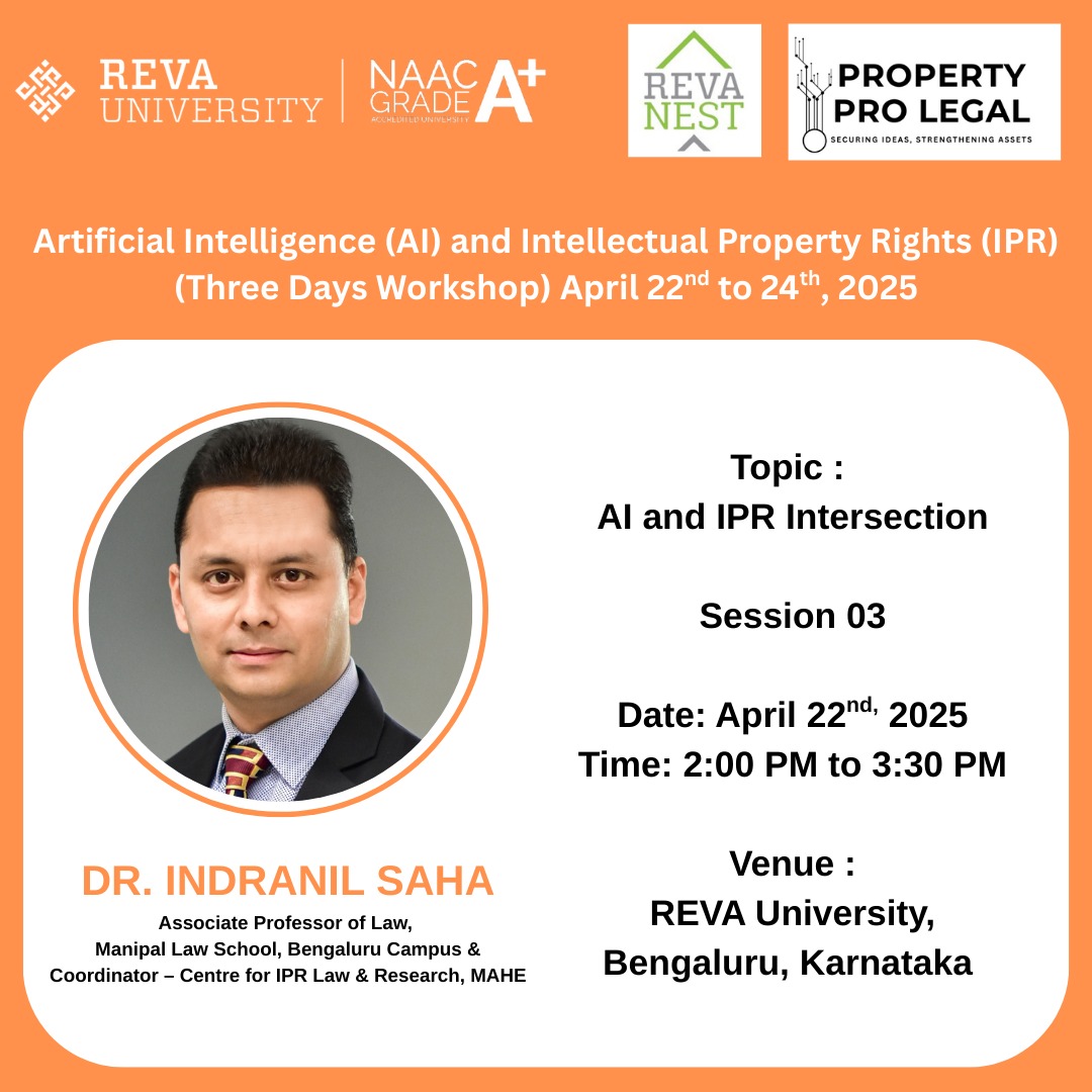 (6) Dr Indranil Saha, Coordinator of the Centre was an invited speaker as an expert in three days workshop in the area of Artificial Intelligence (AI) and Intellectual property Rights, on the topic of “AI and IPR Intersection”, Reva University, Bengaluru, 22nd April, 2025.