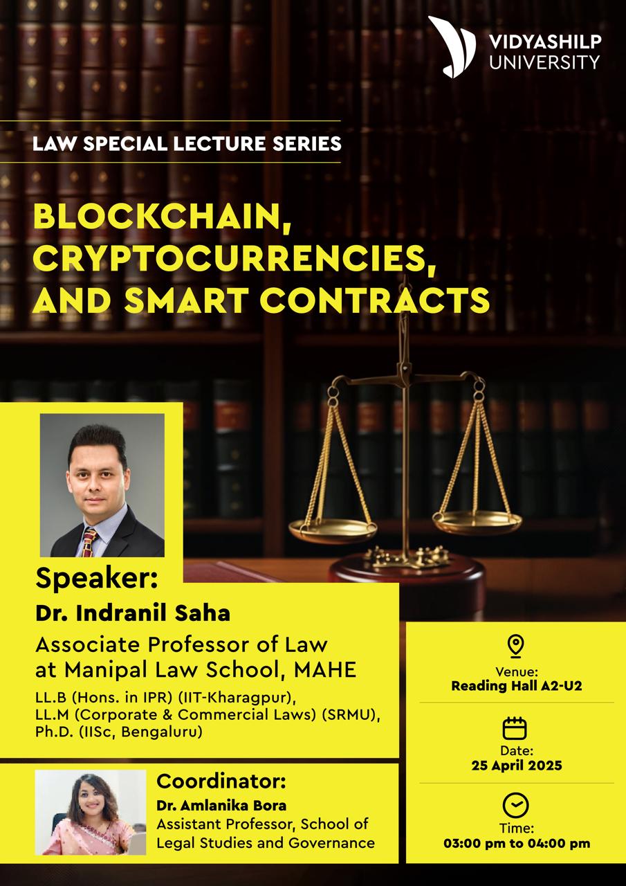 (7) Dr Indranil Saha, Coordinator of the Centre was an invited speaker as an expert, on the topic of “Blockchain, Cryptocurrencies and Smart Contracts” as part of Law Special Lecture Series, Vidyashilp University, Bengaluru, 25th April, 2025.
