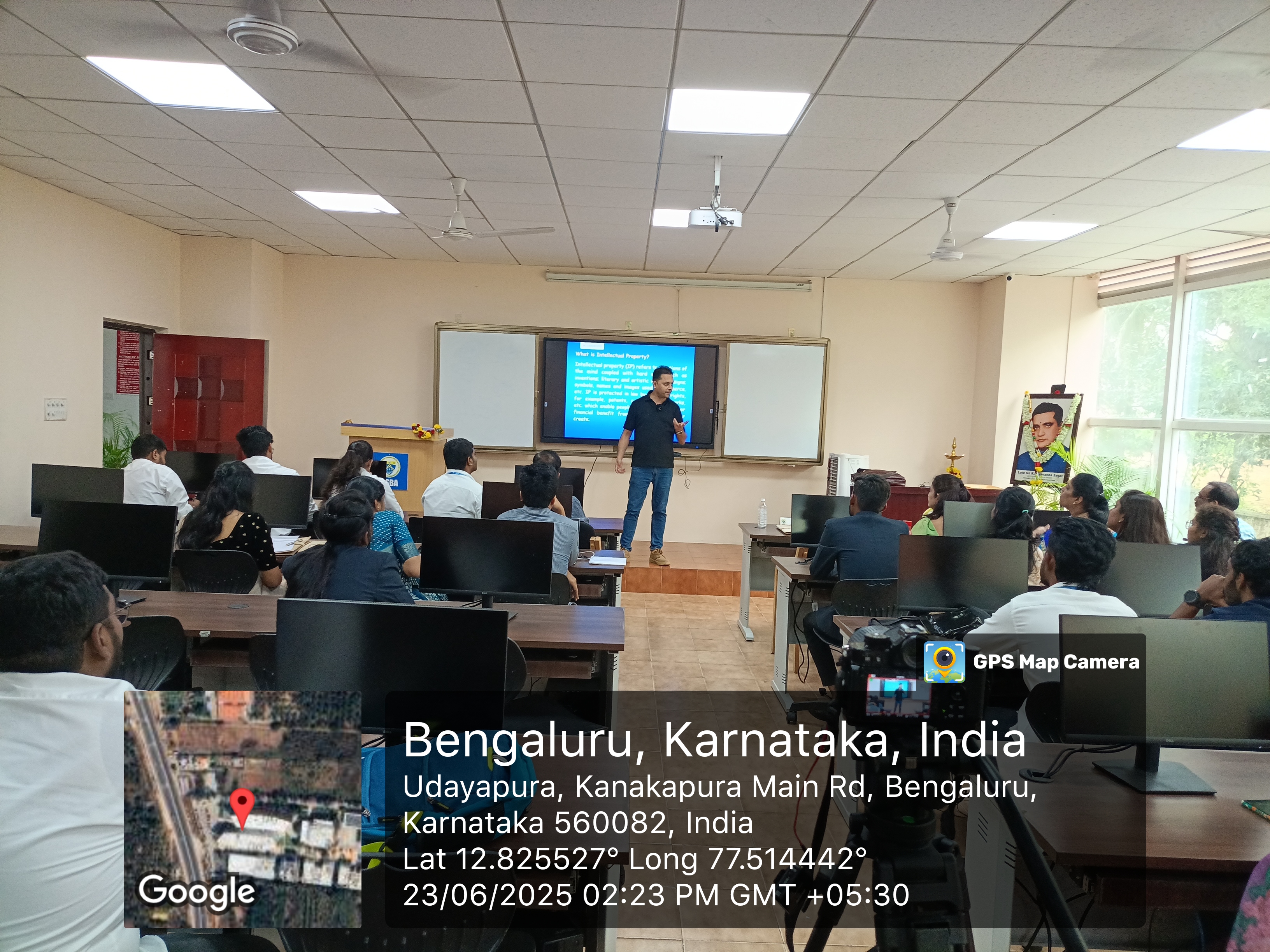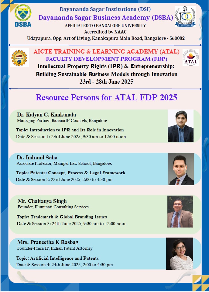 (8) Dr Indranil Saha, Coordinator of the Centre was an invited speaker as an expert, on the topic of “Patents : Concepts, Process and Legal Framework”, ATAL Faculty Development Program, Dayanand Sagar Business Academy, Bengaluru, 23rd – 28th June, 2025.