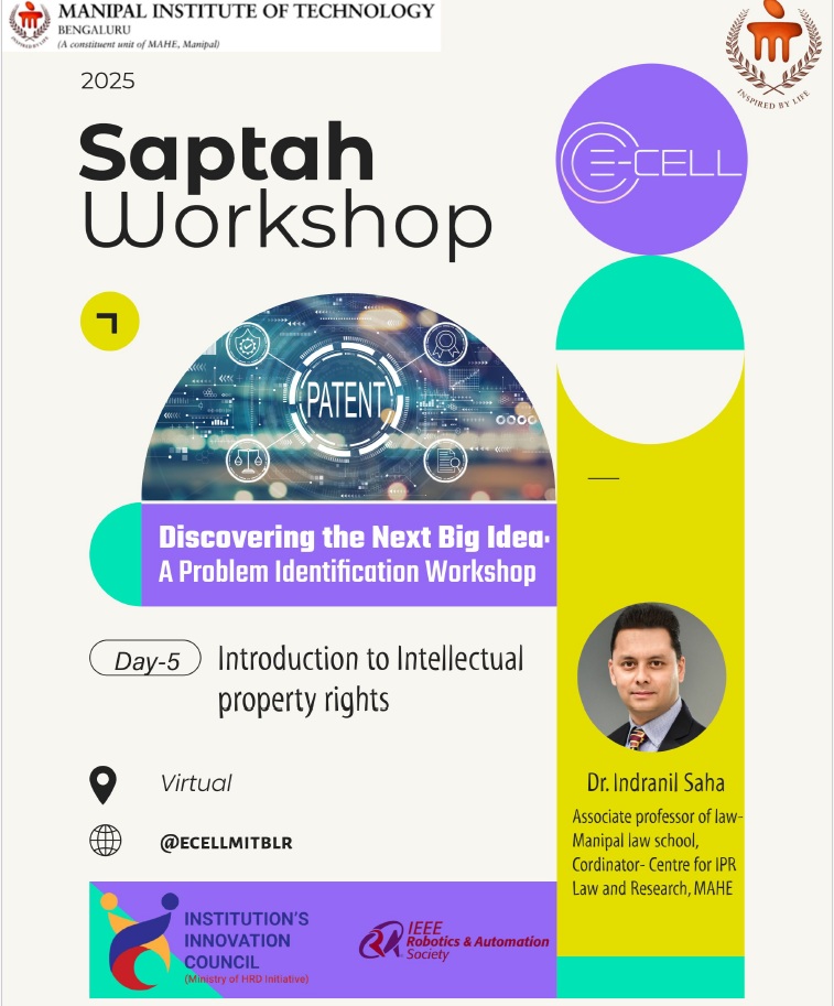 (9) Dr Indranil Saha, Coordinator of the Centre was an invited speaker as an expert on 01st August, 2025, to deliver lecture on the topic of "Introduction to Intellectual property Rights", in a seven-day virtual workshop named "Saptah Workshop: Discovering the Next Big Idea" organized by the Innovation and Incubation Centre (E-Cell) of MAHE- Bengaluru, in association with the Institution’s Innovation Council (a Ministry of HRD initiative) and the IEEE Robotics and Automation Society.