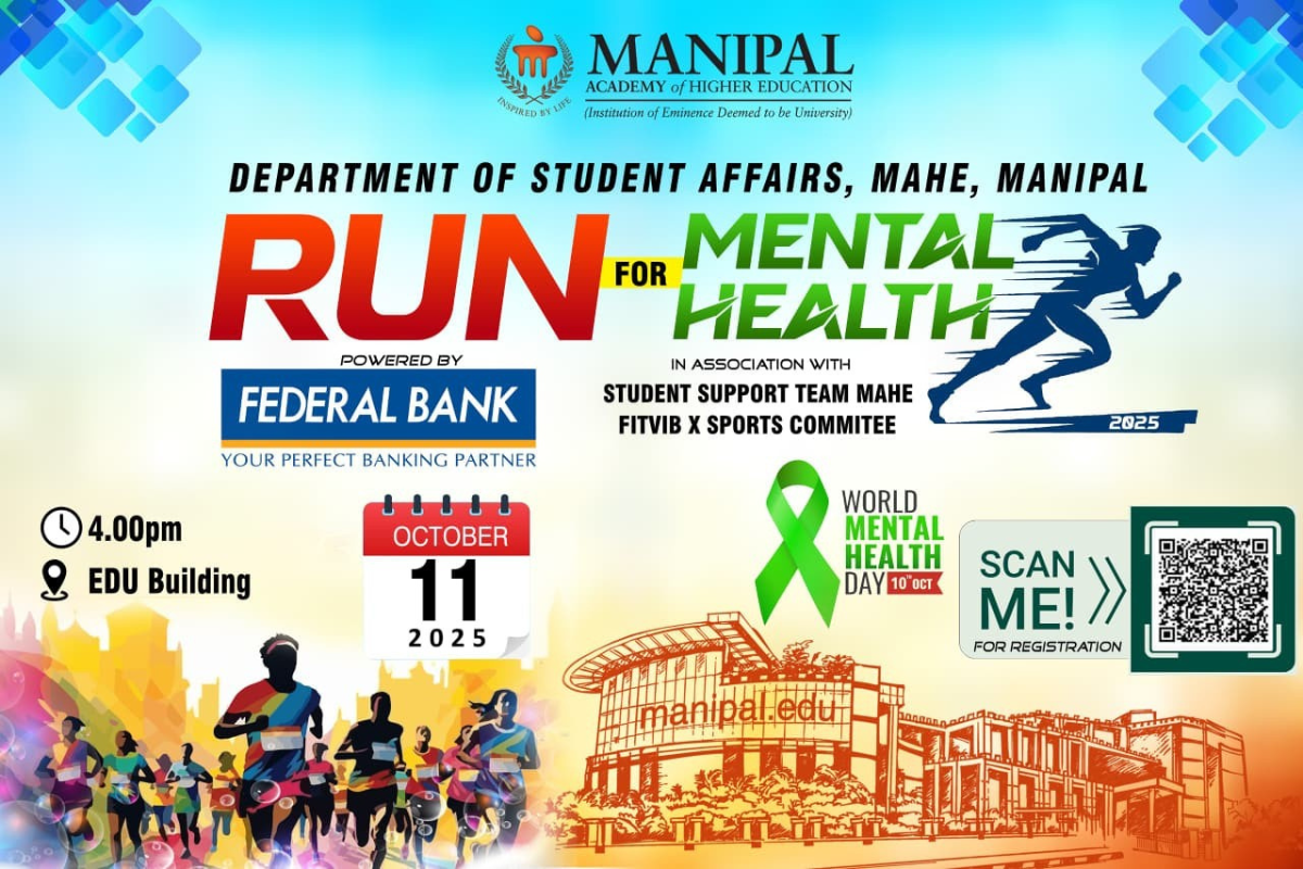 The Department of Student Affairs, in collaboration with Federal Bank, will be organising a 5K Run for Mental Health on Saturday, October 11, at 4:00 pm, starting from the EDU Building, Manipal. The run aims to bring people together, spread awareness, and promote the importance of mental well-being.