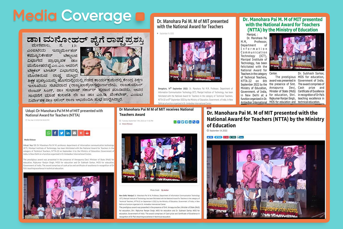 Manipal, 13th September 2022: Dr. Manohara Pai M.M, Professor, Department of Information Communication Technology (ICT), Manipal Institute of Technology, has been felicitated with the National Award for Teachers in the category of Technical Teachers, NTTA-22 on 6th September 2022 by the Ministry of Education, Government. of India, in New Delhi at a function organized in Dr. Ambedkar International Center.