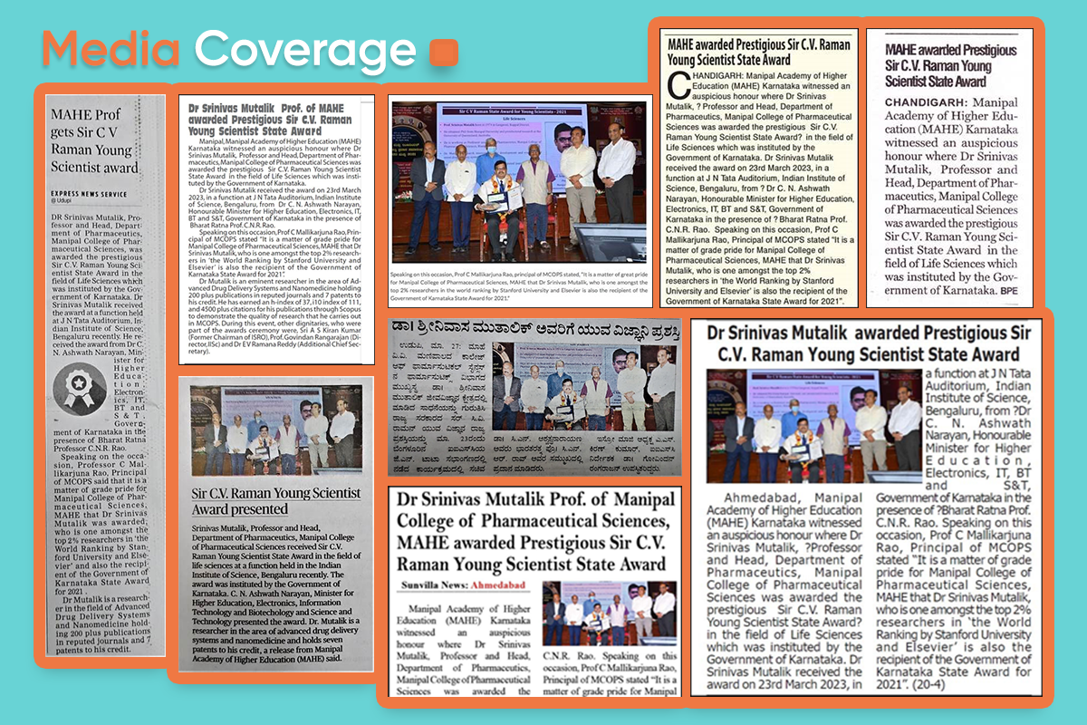 Speaking on this occasion, Prof C Mallikarjuna Rao, Principal of MCOPS stated “It is a matter of grade pride for Manipal College of Pharmaceutical Sciences, MAHE that Dr Srinivas Mutalik, who is one amongst the top 2% researchers in ‘the World Ranking by Stanford University and Elsevier’ is also the recipient of the Government of Karnataka State Award for 2021”.