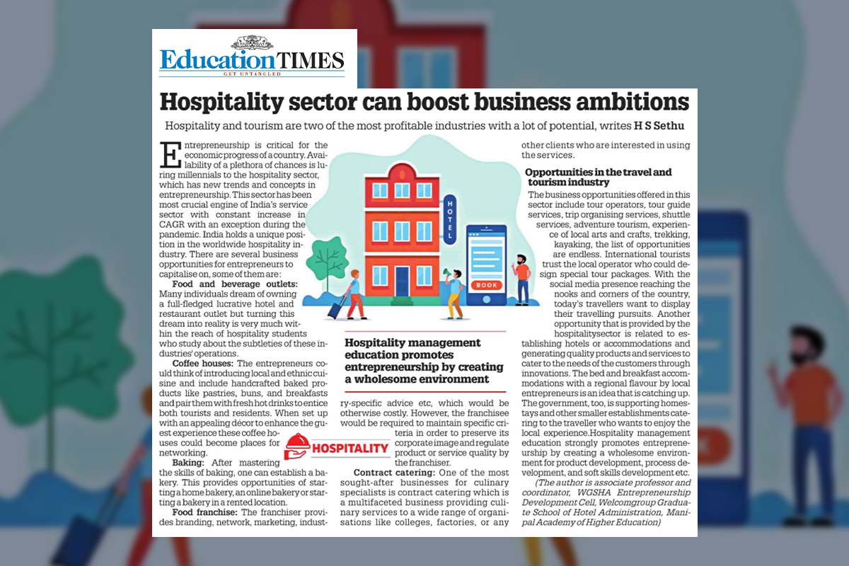 Manipal 21st November 2022: The author’s article, “Entrepreneurial Opportunities in the Hospitality Sector”, by Dr. H.S. Sethu, Associate Professor, and Coordinator for WGSHA Entrepreneurship Development Cell, (Welcomgroup Graduate School of Hotel Administration), MAHE, Manipal.