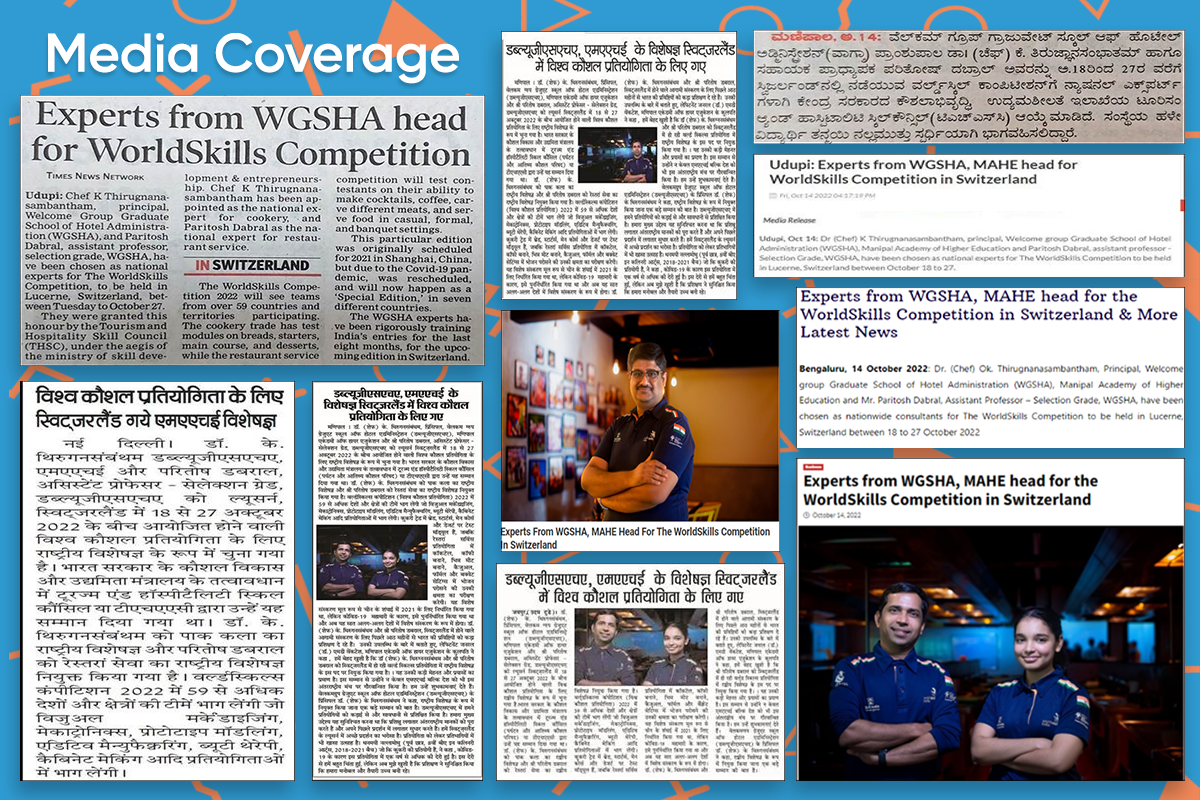 Manipal 14th October 2022: Dr. (Chef) K. Thirugnanasambantham, Principal, Welcome group Graduate School of Hotel Administration (WGSHA), Manipal Academy of Higher Education and Mr. Paritosh Dabral, Assistant Professor - Selection Grade, WGSHA, have been chosen as national experts for The WorldSkills Competition to be held in Lucerne, Switzerland between 18 to 27 October 2022