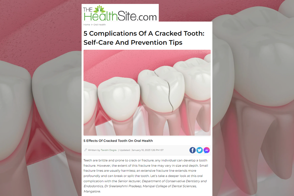 Manipal 10th January 2023: The author's article, "5 Complications Of A Cracked Tooth: Self-Care And Prevention Tips", by Dr. Sreelakshmi Pradeep, Senior lecturer, Department of Conservative Dentistry and Endodontics, Manipal College of Dental Sciences (MCODS), Mangalore.