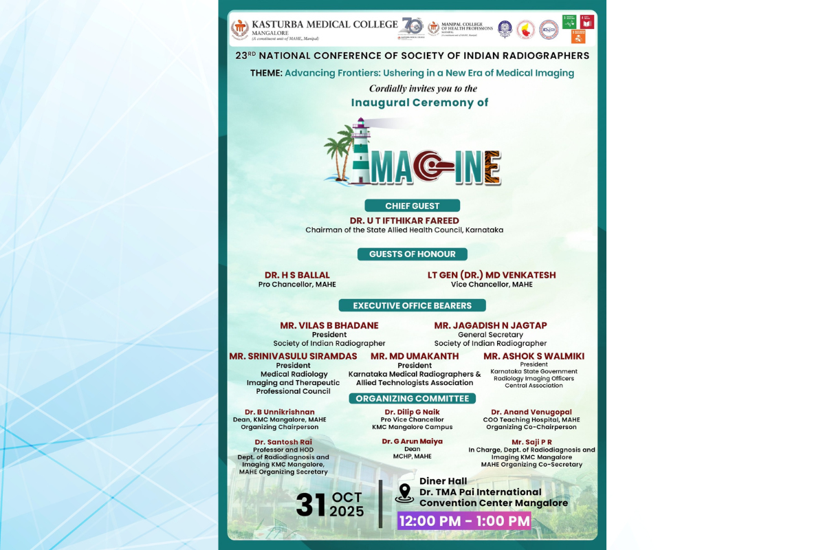 The 23rd National Conference of the Society of Indian Radiographers IMAGINE 2025 will be hosted by the Department of Radiodiagnosis and Imaging at Kasturba Medical College (KMC), Mangalore. Organised in partnership with the Karnataka Medical Radiographers and Allied Technologists Association and the Karnataka State Government Radiology Imaging Officers Central Association, the conference will serve as a leading platform for knowledge exchange and professional collaboration.