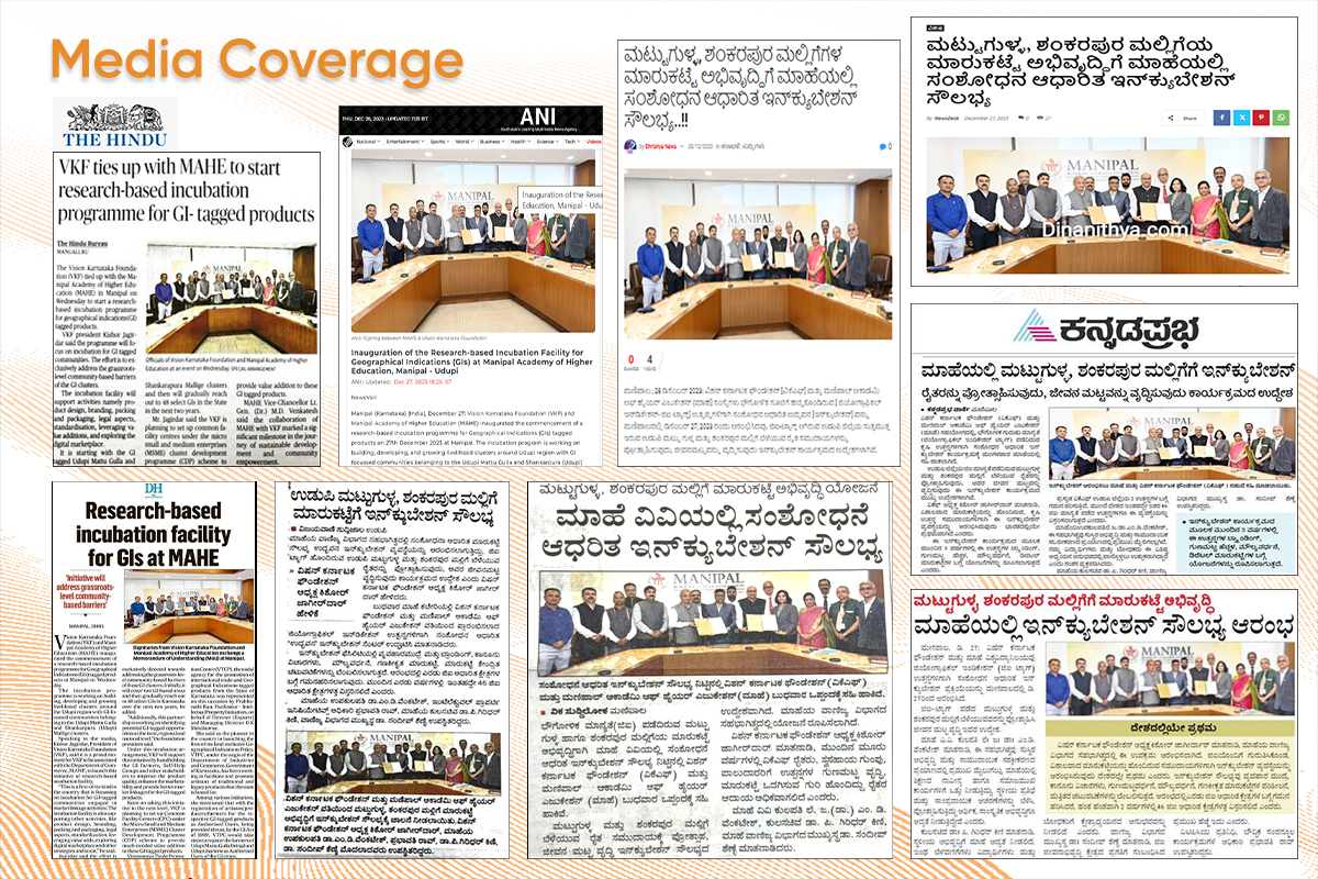 Manipal, 27 December 2023: Vision Karnataka Foundation (VKF) and Manipal Academy of Higher Education (MAHE) inaugurated the commencement of a research-based incubation programme for Geographical Indications (GIs) tagged products on 27th December 2023 at Manipal. The incubation program is working on building, developing, and growing livelihood clusters around Udupi region with GI focussed communities belonging to the Udupi Mattu Gulla and Shankarpura (Udupi) Mallige clusters.