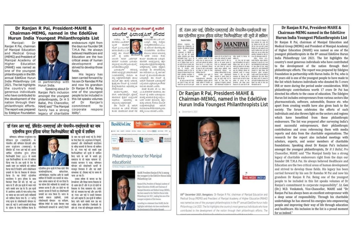December 2021, Manipal: Dr Ranjan R Pai, chairman of Manipal Education and Medical Group (MEMG) and President of Manipal Academy of Higher Education (MAHE) was named as one of the youngest philanthropists in the 8th annual EdelGive Hurun India Philanthropy List 2021. The list highlights the country’s most generous individuals who have contributed to the development of the nation through their philanthropic efforts. The report was prepared by Edelgive Foundation in partnership with Hurun India.