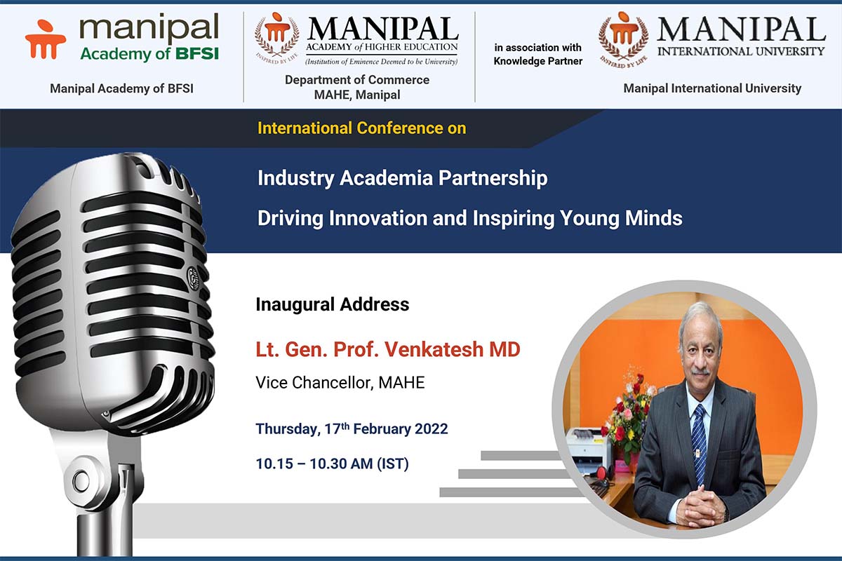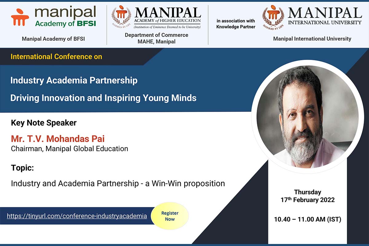 A virtual international conference on “Industry-Academia Partnership - Driving Innovation and Inspiring Young Minds” will be held on 17th and 18th February 2022, in collaboration with the Department of Commerce MAHE and Manipal International University, Malaysia.