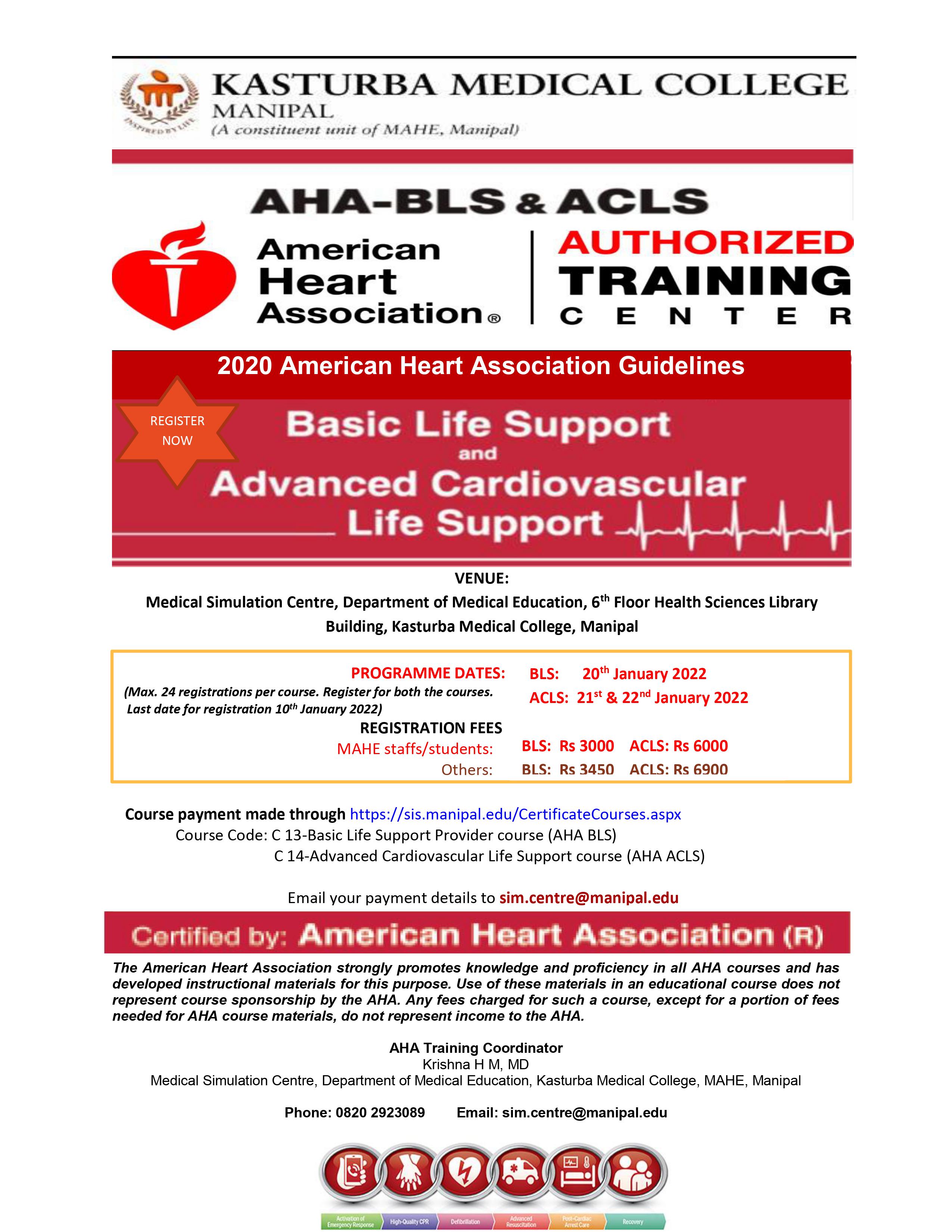 21st Dec, Manipal: Registration opens for BLS and ACLS, American Heart Association (AHS) and Kasturba Medical College (KMC), Manipal established an authorized Training Center for Basic Life Support and Advanced Cardiovascular Support at KMC in Manipal.