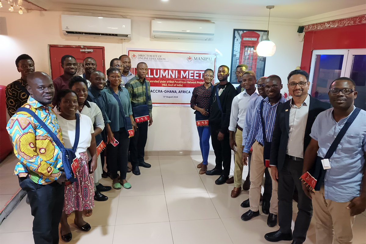 Manipal, 24th August 2024: Manipal Academy of Higher Education (MAHE) organised a landmark alumni meet for its online students at Accra, Ghana, on 13th August 2024, making it the first such event held on the African continent. About 20 students who had availed of scholarships provided by the Ministry of External Affairs, Government of India, through the e-VidyaBharati e-ArogyaBharati (eVBAB) Pan African Network Project participated in the event.