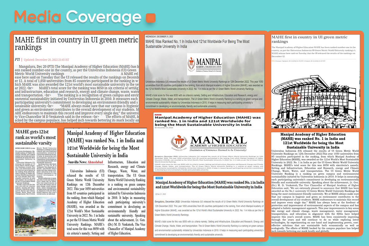 Speaking about the achievement, Lt. Gen. (Dr.) M. D. Venkatesh, The Vice Chancellor of Manipal Academy of Higher Education said, “We are extremely pleased to announce that MAHE has been awarded as the No.1 university UI Green Metric World University Rankings for being the most environmentally friendly university. We at MAHE always make sure that our campus is hygienic and green as the environment contributes to the overall development of our students. MAHE endeavors to maintain this record and improve every single day.”