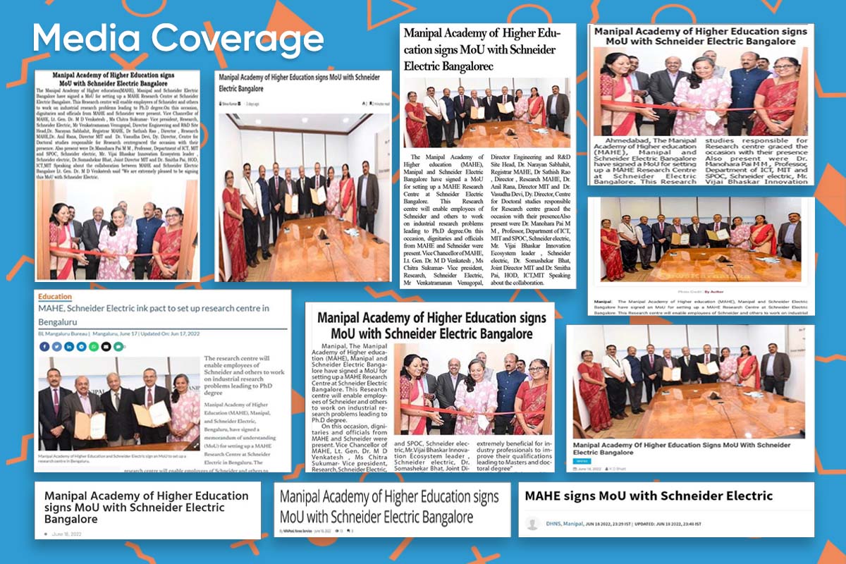 Manipal, 20th June 2022: The Manipal Academy of Higher education (MAHE), Manipal, and Schneider Electric Bengaluru have signed an MoU for setting up a MAHE Research Centre at Schneider Electric Bengaluru. This Research center will enable employees of Schneider and others to work on industrial research problems leading to the Ph.D. degree.