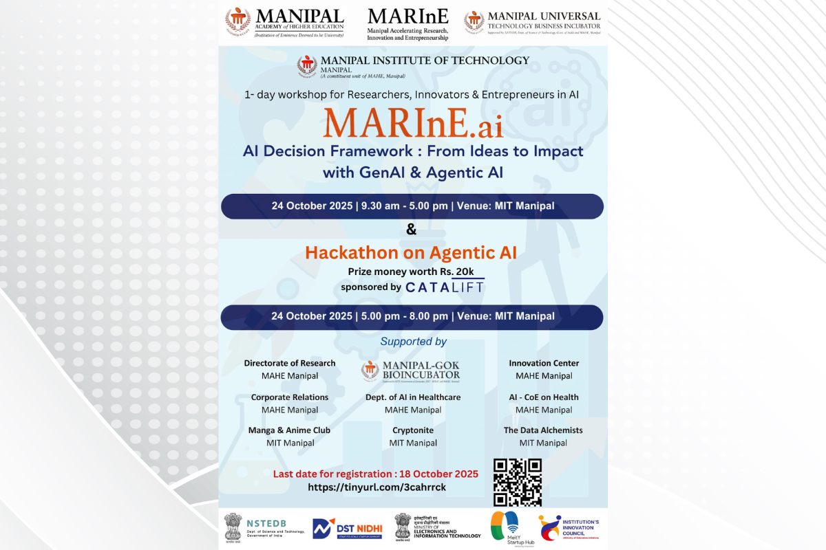 Manipal Universal Technology Business Incubator (MUTBI), in collaboration with the Manipal Institute of Technology (MIT), will be organising a one-day Workshop and Hackathon under MARInE.ai, Manipal Accelerating Research, Innovation & Entrepreneurship in AI. The Hackathon aims to promote creativity, collaboration, and innovation among researchers, students, and aspiring entrepreneurs by providing a platform to explore emerging trends and real-world applications of Artificial Intelligence.