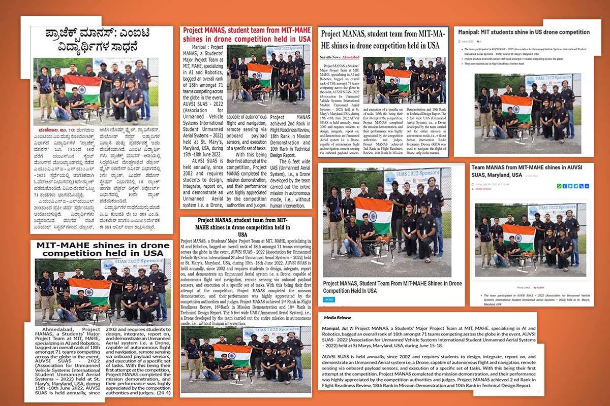 Manipal July 07th, 2022: Project MANAS, a Students’ Major Project Team at MIT, MAHE, specializing in AI and Robotics, bagged an overall rank of 18th amongst 71 teams competing across the globe in the event, AUVSI SUAS - 2022 (Association for Unmanned Vehicle Systems International Student Unmanned Aerial Systems – 2022) held at St. Mary's, Maryland, USA, during 15th -18th June 2022.