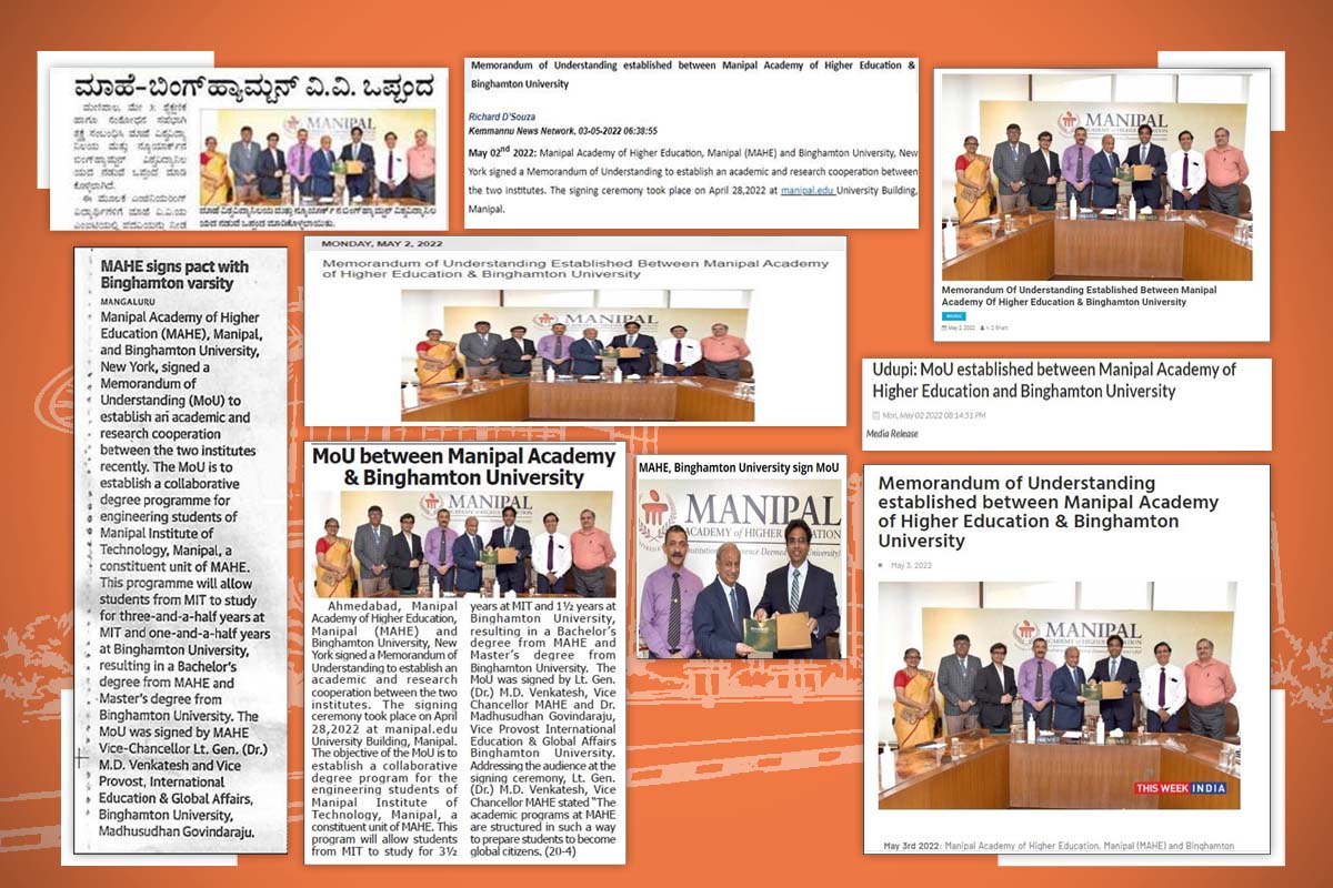 May 04th 2022: Manipal Academy of Higher Education, Manipal (MAHE) and Binghamton University, New York signed a Memorandum of Understanding to establish an academic and research cooperation between the two institutes. The signing ceremony took place on April 28, 2022, at manipal.edu University Building, Manipal.