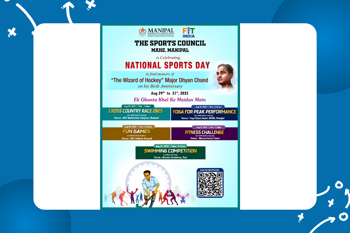 The Sports Council of MAHE, Manipal, will celebrate National Sports Day from August 29 to 31, 2025. The day is observed in memory of the great hockey player Major Dhyan Chand, who is known as “The Wizard of Hockey.” The celebration will mark his birth anniversary and encourage sportsmanship, teamwork, and physical fitness among the MAHE community.