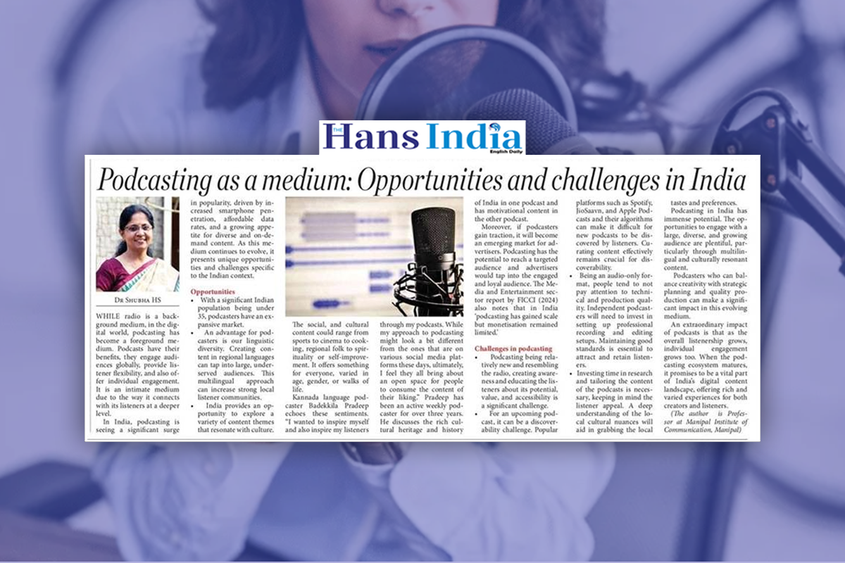 Manipal, September 11, 2024: The author's article, Podcasting as a Medium: Opportunities and Challenges in India, by Dr Shubha H S, Professor, Manipal Institute of Communication (MIC), Manipal.