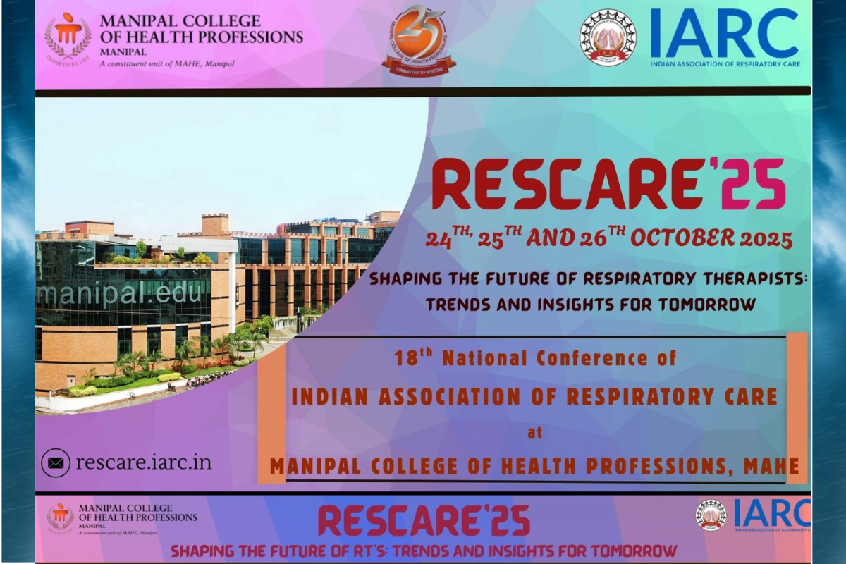 The Department of Respiratory Therapy, Manipal College of Health Professions (MCHP), MAHE, in collaboration with the Indian Association of Respiratory Care (IARC), will be organising the 18th National Conference, RESCARE 2025, from 24th to 26th October 2025 with the theme “Shaping the Futures of Respiratory Therapists: Trends and Insights for Tomorrow”, the conference will bring together leading experts, practitioners, researchers, and students to deliberate on emerging trends, innovations, and challenges in respiratory care.