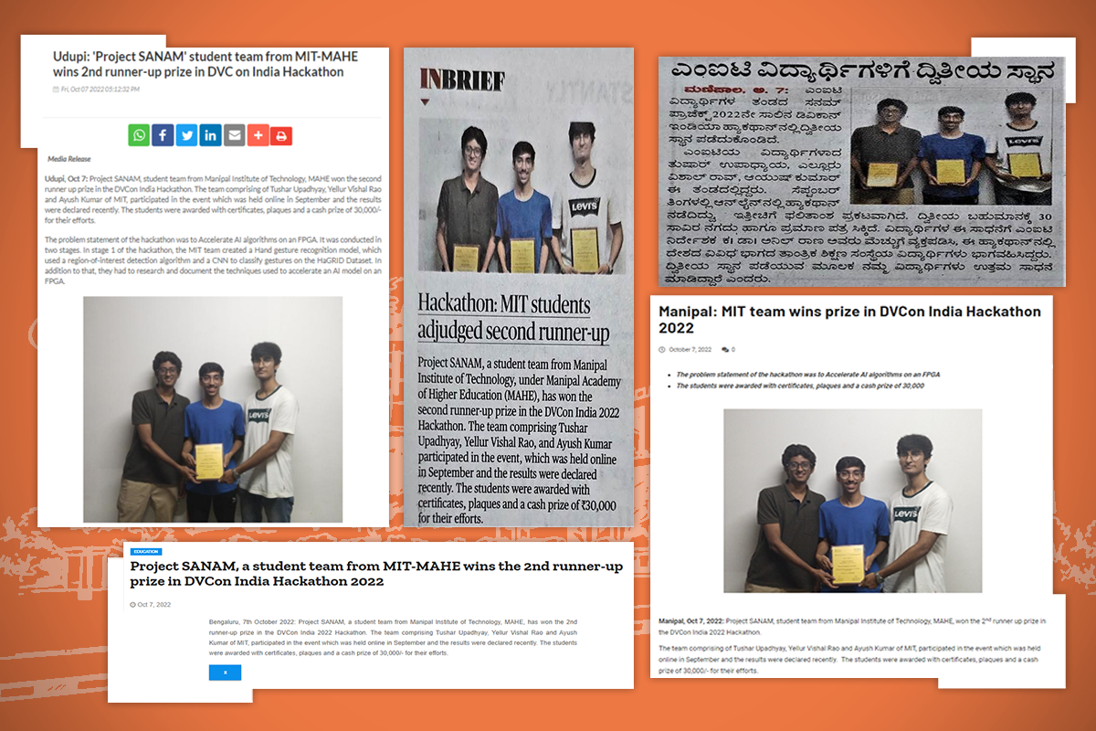 Manipal, 7th October 2022: Project SANAM, the student team from Manipal Institute of Technology, MAHE, has won the 2nd runner-up prize in the DVCon India 2022 Hackathon. The team comprising Tushar Upadhyay, Yellur Vishal Rao, and Ayush Kumar of MIT, participated in the event which was held online in September and the results were declared recently. The students were awarded certificates, plaques, and a cash prize of 30,000/- for their efforts.