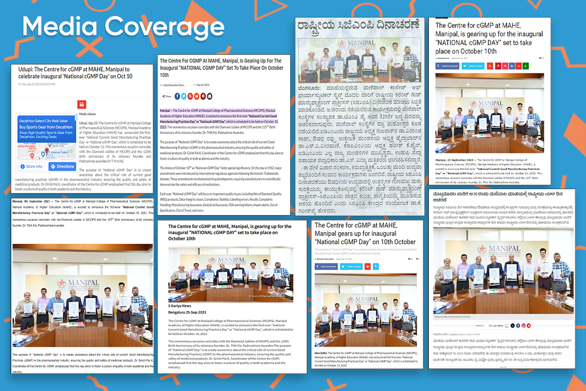 Manipal, 25th September 2023: The Centre for cGMP at Manipal College of Pharmaceutical Sciences (MCOPS), Manipal Academy of Higher Education (MAHE), is excited to announce the first-ever "National Current Good Manufacturing Practices Day" or "National cGMP Day", which is scheduled to be held on October 10, 2023. This momentous occasion coincides with the Diamond Jubilee of MCOPS and the 125th Birth Anniversary of its visionary founder, Dr. TMA Pai, Padmashree Awardee.