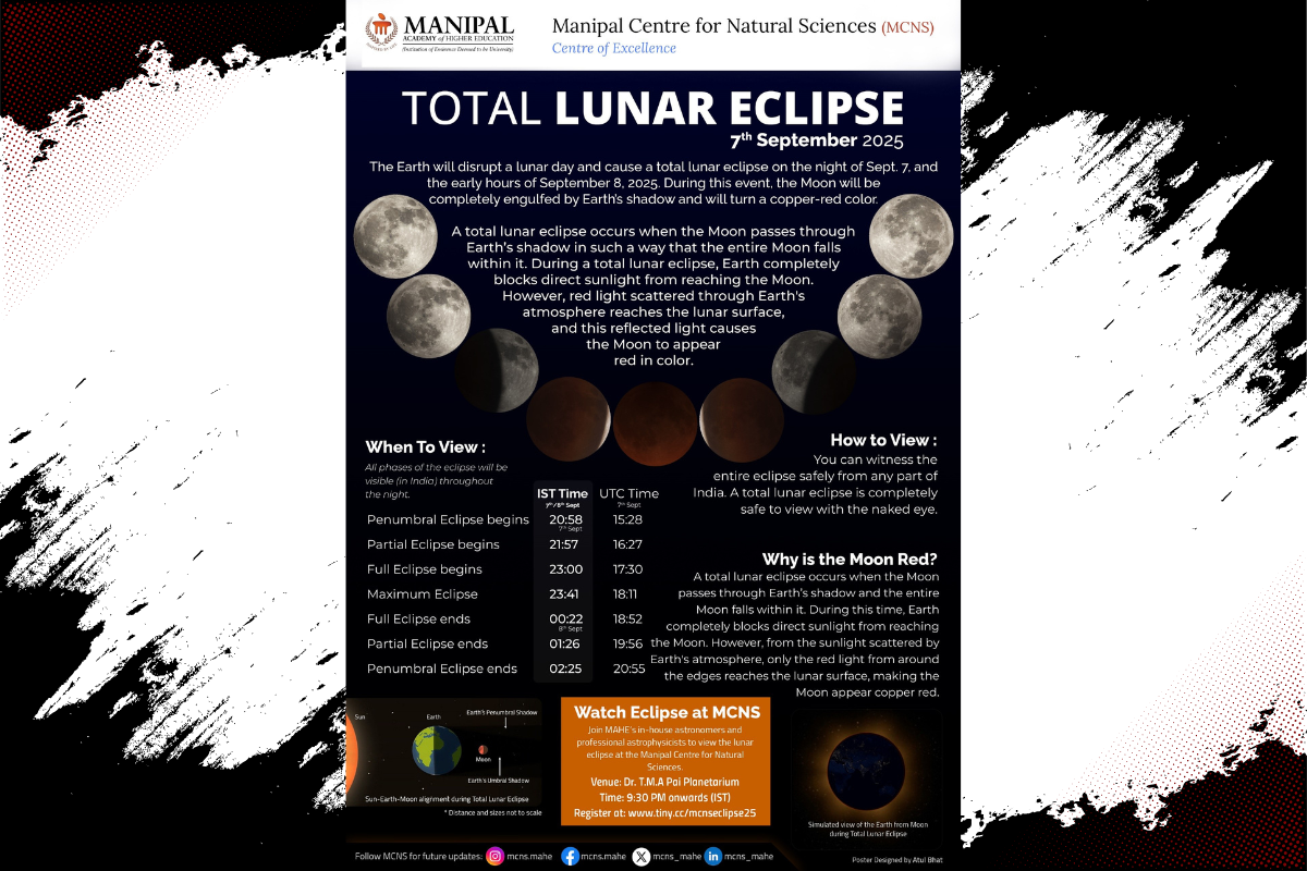 Join us at the Manipal Centre for Natural Sciences (MCNS), Manipal, on September 7, 2025, to witness the beauty of the lunar eclipse. This special event will offer a chance to view the eclipse through telescopes and learn more about the science behind it from experts.