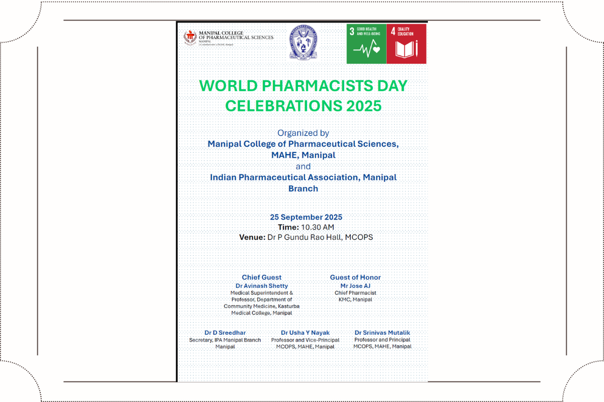 Manipal College of Pharmaceutical Sciences (MCOPS), Manipal, in collaboration with the Indian Pharmaceutical Association, Manipal Branch, will be organising the World Pharmacist Day Celebration 2025. The event will highlight the vital role of pharmacists in advancing healthcare, ensuring safe and effective use of medicines, and promoting patient well-being.