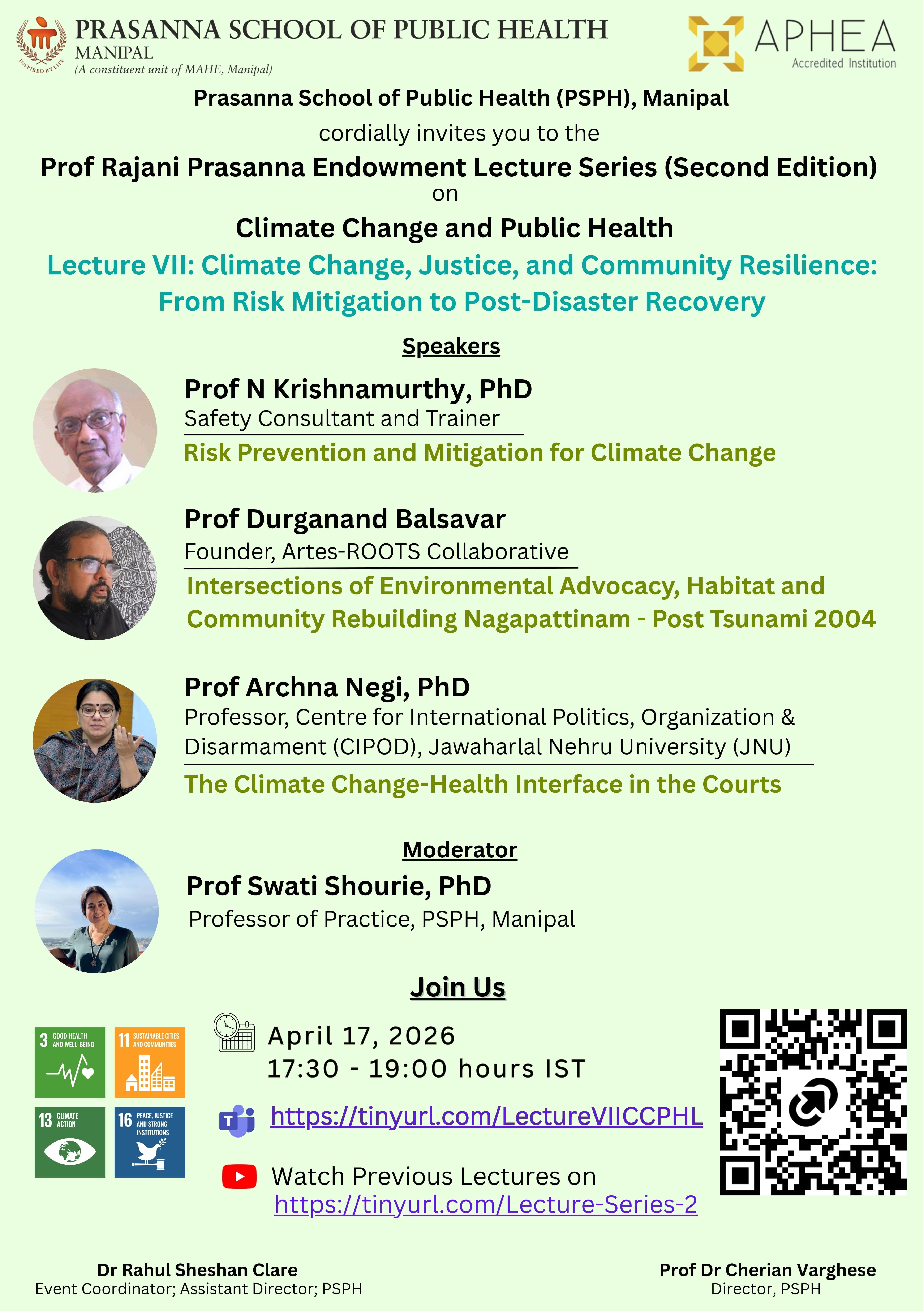 Established in 2009 as the Department of Public Health, PSPH became a proud constituent unit of MAHE in 2017, bringing together specialized departments in Applied Statistics and Data Science, Health Technology and Informatics, Healthcare and Hospital Management, Social and Health Innovation, and Global Public Health Policy and Governance.